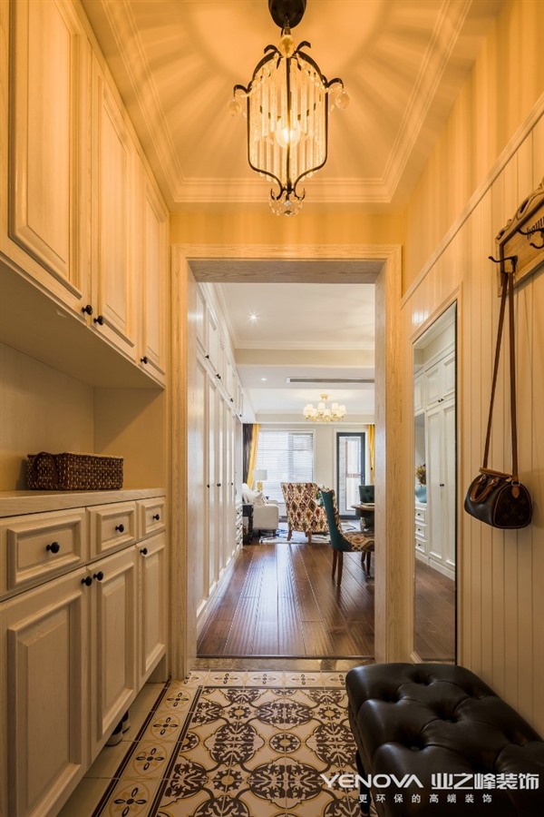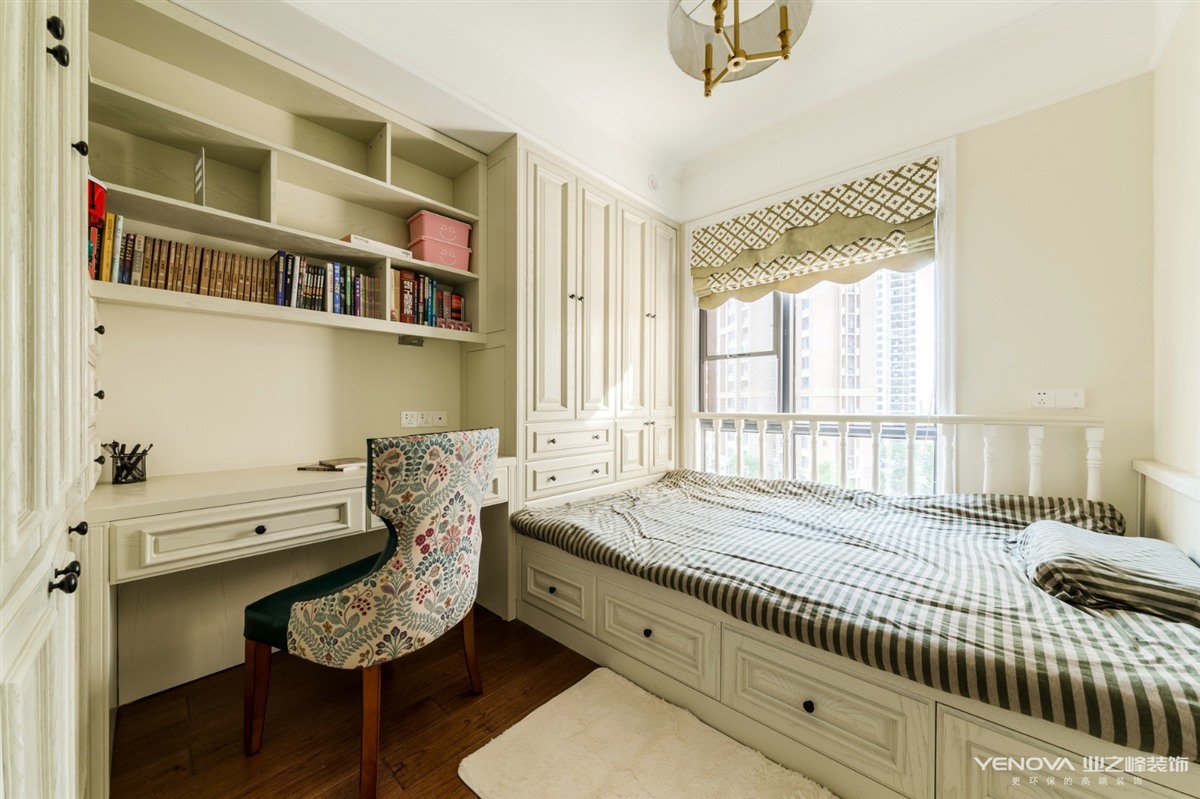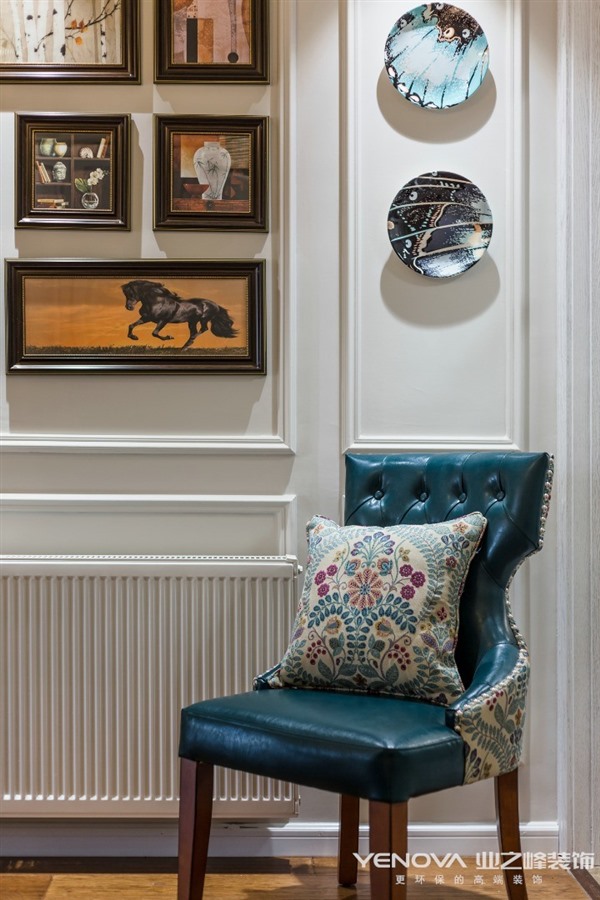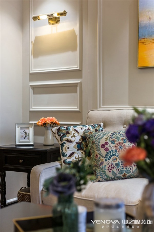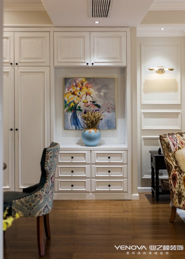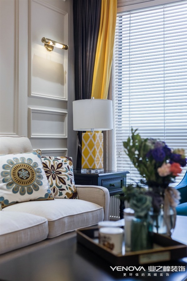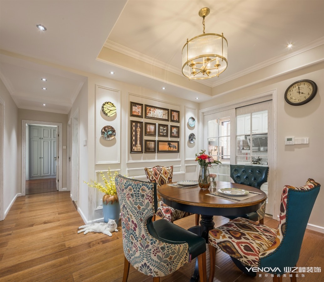 以优雅的美式风格定位,空间用以低奢的色彩和谐相处,以金色系、蓝色系、米色等弥漫着典雅与温馨的格调。其实设计风格中融入具象艺术画、鼓凳、托盘、优雅的花卉,增添些五彩斑斓的书籍的文艺味,空间充满温暖阳光与怡然的生活方式。