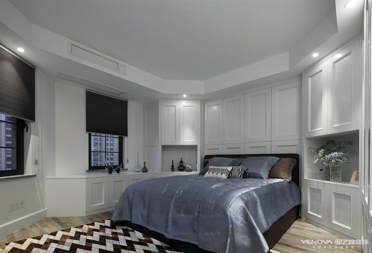 主卧以大面积的白色柜体为主,但因为主卧为多边异性,所以在设计中将床的周围都设计了收纳柜增加了储物空间,搭上浅灰色底板,使得空间更具舒适性,也