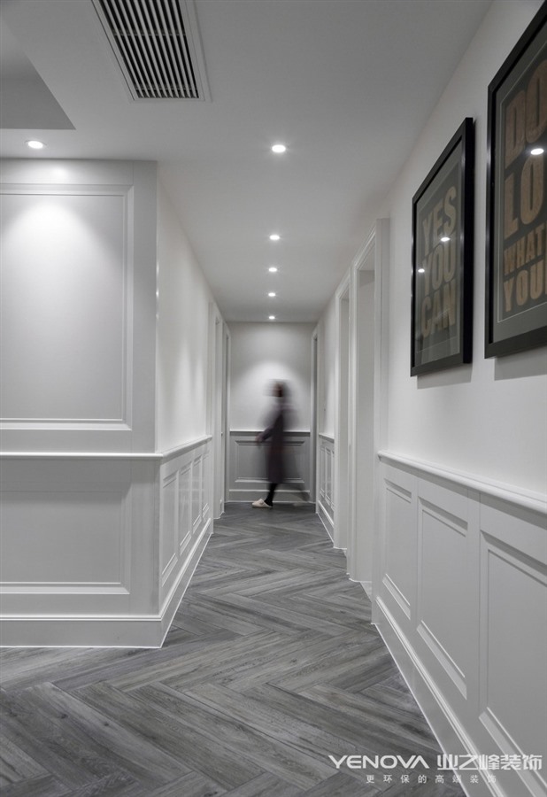 本案以纯白色为主基调,浅蓝色,卡其色作为辅助色成为整个空间的调剂色。材质上运用纯白色护墙板和白色涂料在同色的环境下,同色但材质的质感不一样,使得空间的层次更富有立体感。