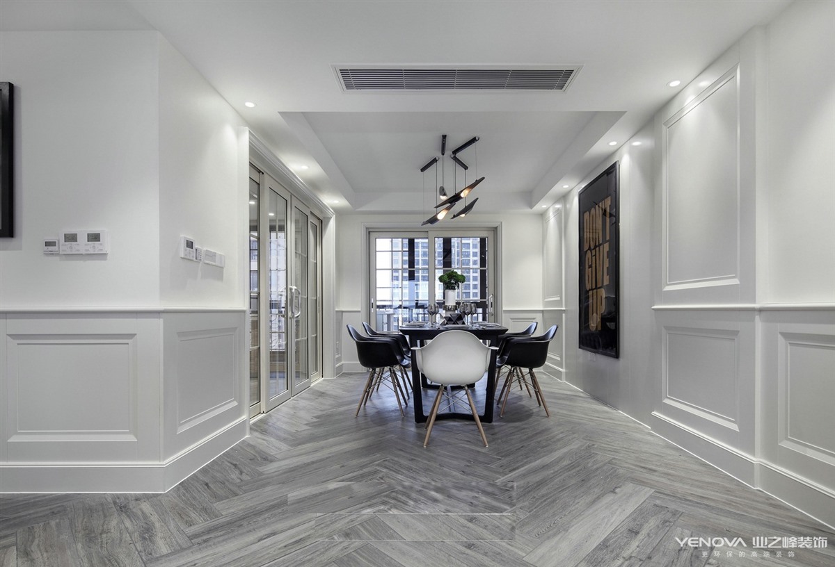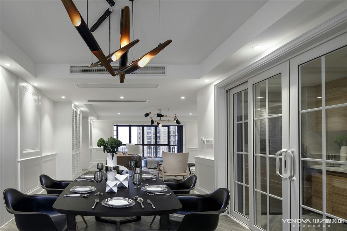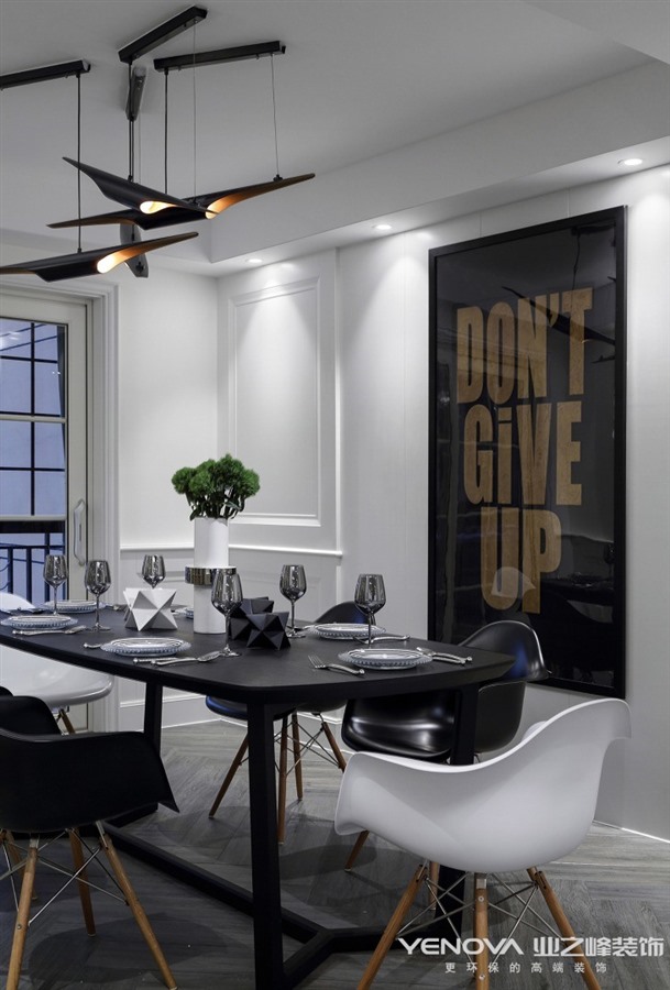 餐厅搭配黑色的桌椅,与白色主题形成对比,使得整个空间布置与死板,极具艺术观赏性,为空间增添了独特设计对比感。与暗黄色灯具的搭配,打造出轻松优雅的用餐空间。