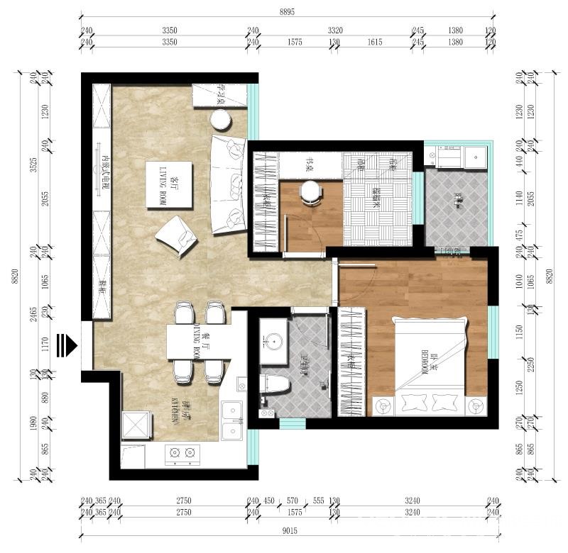 客户喜欢明亮通透的感觉,选择了现代简约风格。在颜色上喜欢比较雅致的灰色系。因此设计师在设计中选择了暖色系的奶咖色乳胶漆饰面。格局上选择开放式厨房,将整个厨房和客餐厅做为一个整体,显得大气通透。