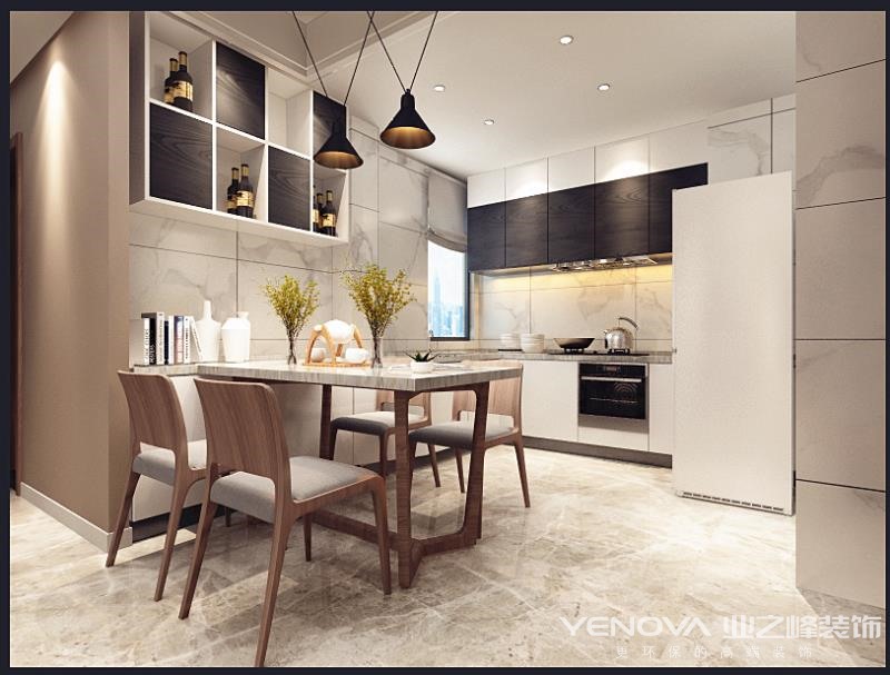 本案中,电视背景墙采用一整排柜子的形式,不仅解决了进门鞋柜的问题,也扩大了整个家的收纳功能,更显得进门干净整洁。采用黑白调色,使整个背景墙并不会因为全是柜子而显得呆板。因为面积较小,所以收纳是一个很有必要的需求。餐厅和开放式厨房一体,不仅扩大了厨房台面的使用面积,也衔接了餐厅的功能。大面积采用爵士白纹瓷砖,在简约中又透出一丝时尚和精致。地砖采用仿大理石纹路的浅黄色地砖,与墙面有着色系的统一又有着质地的区别,统一中又有着不同。