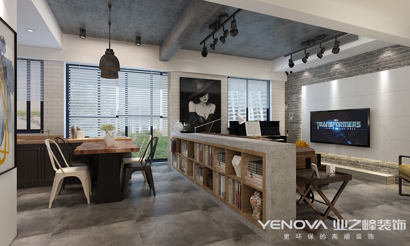 这个户型整体来说是十分规整的,房间都很方正采光也相当好。层高2880相对来说十分舒服了。可能最大的问题就是客餐厅功能分区不是很明显,整个客餐厅空间并不是很大。厨房去掉管道和柱子的位子实际的橱柜也相当的小。介于业主平时在家做饭的频率并不是很高,又需要一个大的办公区域。那么这个方案就把原本的厨房能打掉的墙体全部拿掉,做一个开放式的厨房,把橱柜整个延伸出去选用比较个性工业的大板与整个岛台链接在一起。形成一个开放式的厨房与餐厅一体。那么通过一个很具有工业感的水泥书架把客厅餐厅一分为二,不仅可以放置一些书和装饰品,同时也使得沙发有靠山,也有一个功能分区的衔接作用。客厅背景墙选用砖墙取代单调的粉刷墙面
