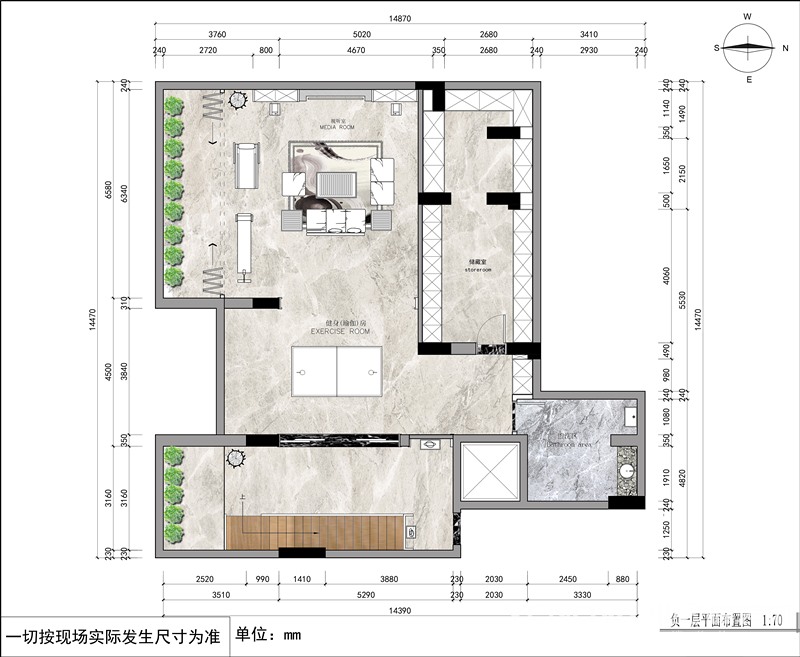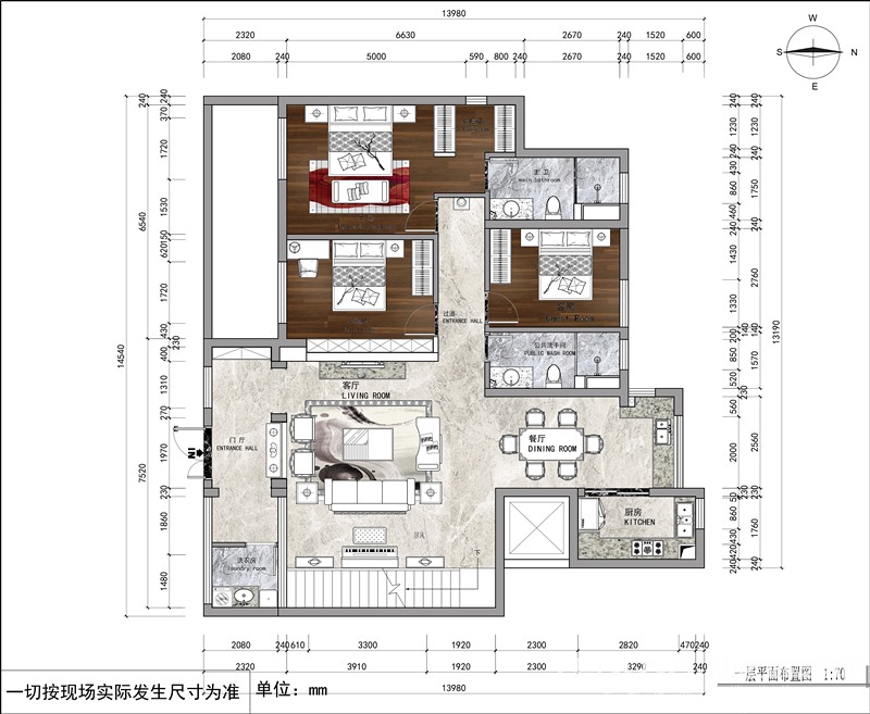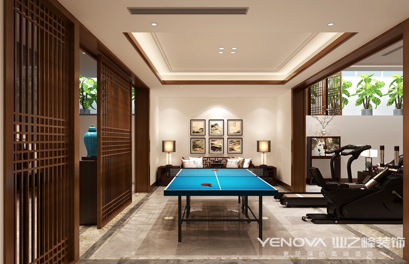 本案的设计以中国传统风格为基础,将现代文化和传统元素结合,让传统在现代手法下充分体现。客厅背景墙的设计采用国画图案作为整体墙面造型,在需要隔绝视线的地方,则使用中式的屏风或窗棂, 保持空间私密的同时也使空间具有延伸感。空间装饰多采用简洁硬朗的直线条。直线装饰在空间中的使用,不仅反映出现代人追求简单生活的居住要求,更迎合了中式家具追求内敛、质朴的设计风格,使“新中式”更加实用、更富现代感 。