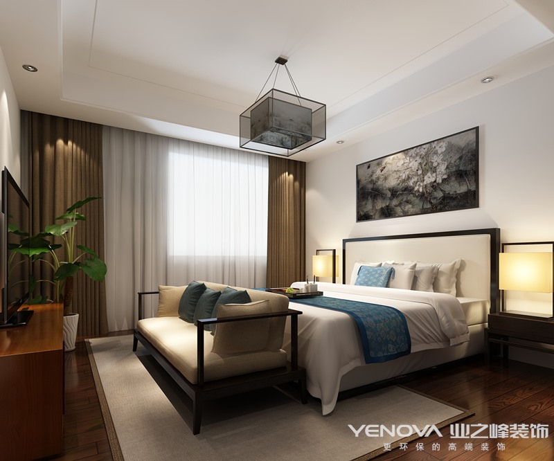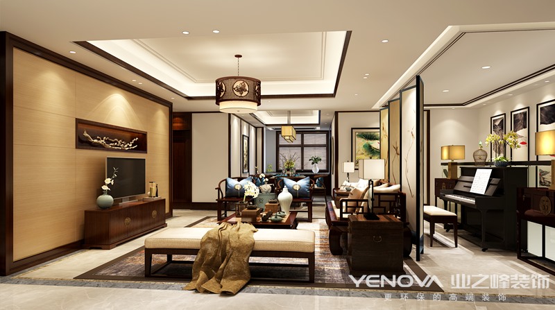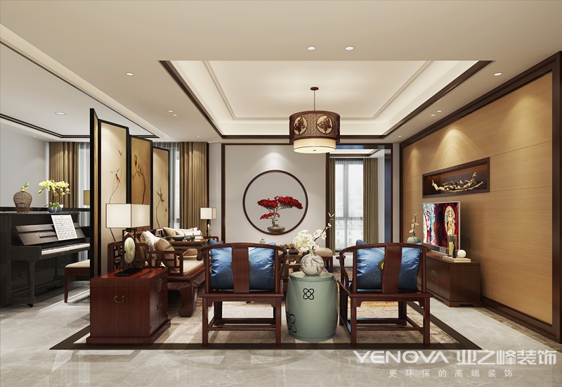要采用硬朗简洁的直线条,空间具有层次感。既使得中式家具古典、质朴的内涵显现,又符合现代人追求的时尚感、实用性。在室内设计中,一贯追求照搬古代设计往往效果不尽如人意,更要注重加入现代元素。现代技术中有很多新型材料,就可以善加利用进去。另外在设计中也可以把主人的个人喜好、品味等也加入进去。既满足现代人居住的要求,迎合中式家具的设计风格在中国文化风靡全球的现今时代,中式元素与现代材质的巧妙兼柔,明清家具、窗棂、布艺床品相互辉映,再现了移步变景的精妙小品。 本案的设计以中国传统风格为基础,将现代文化和传统元素结合,让传统在现代手法下充分体现。客厅背景墙的设计采用国画图案作为整体墙面造型,在需要隔绝视线的地方,则使用中式的屏风或窗棂, 保持空间私密的同时也使空间具有延伸感。空间装饰多采用简洁硬朗的直线条。直线装饰在空间中的使用,不仅反映出现代人追求简单生活的居住要求,更迎合了中式家具追求内敛、质朴的设计风格,“新中式”更加实用、更富现代感 。在中国文化风靡全球的现今时代,中式元素与现代材质的巧妙兼柔,明清家具、窗棂、布艺床品相互辉映,再现了移步变景的精妙小品。