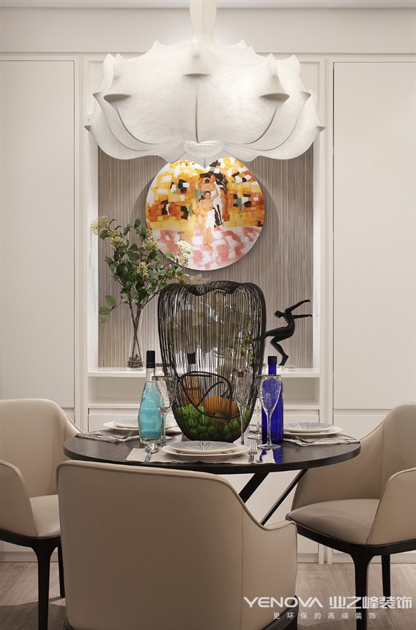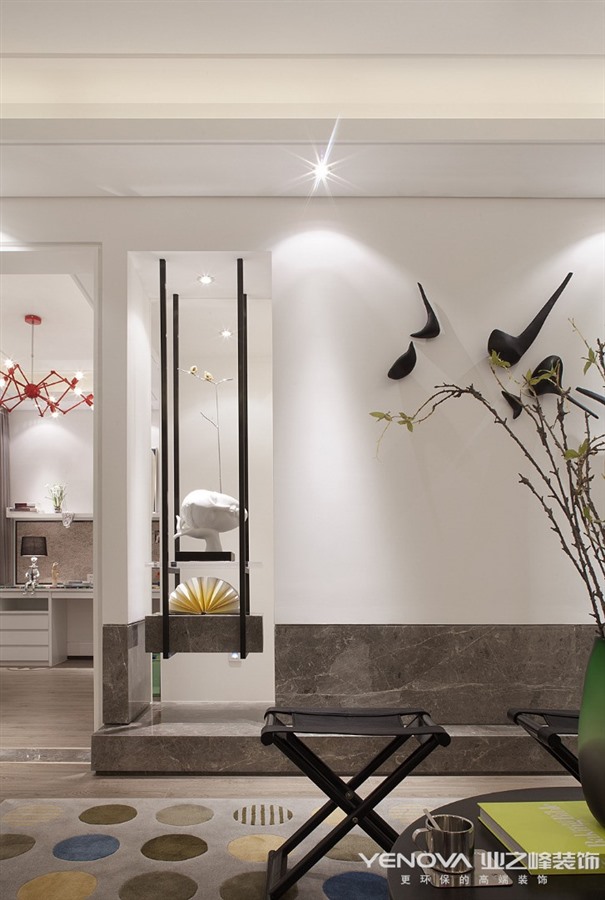 本案做的是融合现代风格的北欧,此北欧风格主要以棕灰白的墙面地面为主,再搭配一些非常古香古色的花艺和茶具,在整体明亮的现代简约风中又有一丝传统的古典风味。
