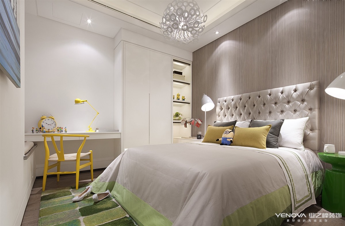 主卧选择了和客厅一样的浅棕色墙纸,床垫和飘窗垫则选择了浅灰色。还是将简约和古朴感进行到底。而儿童房则有了巨大的反差,选择用黄色作为整个房间的点缀颜色。房里的小黄人也这种小朋友最喜欢的玩偶。