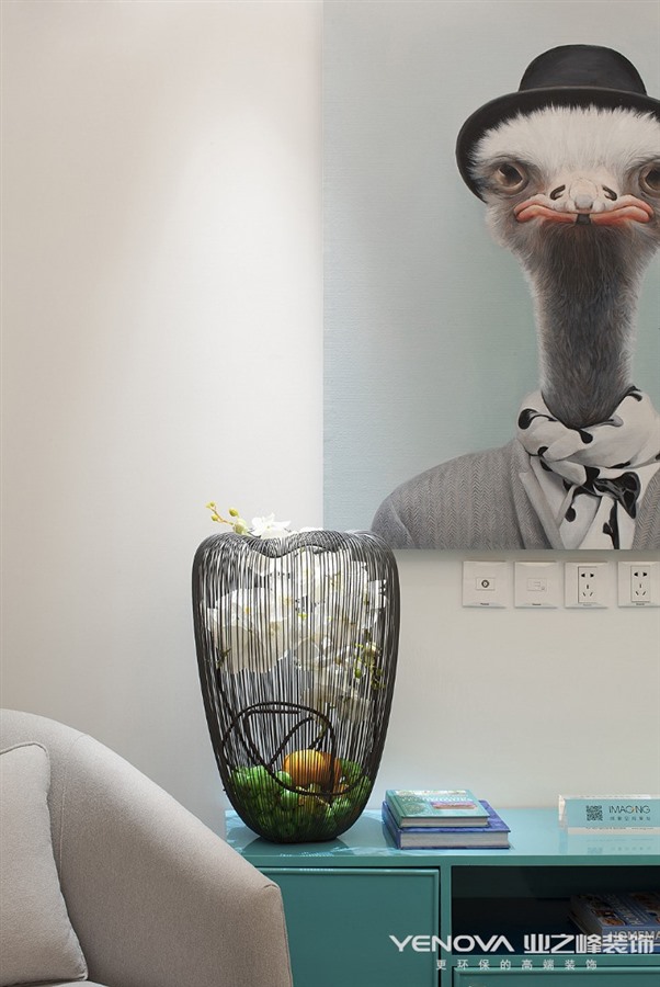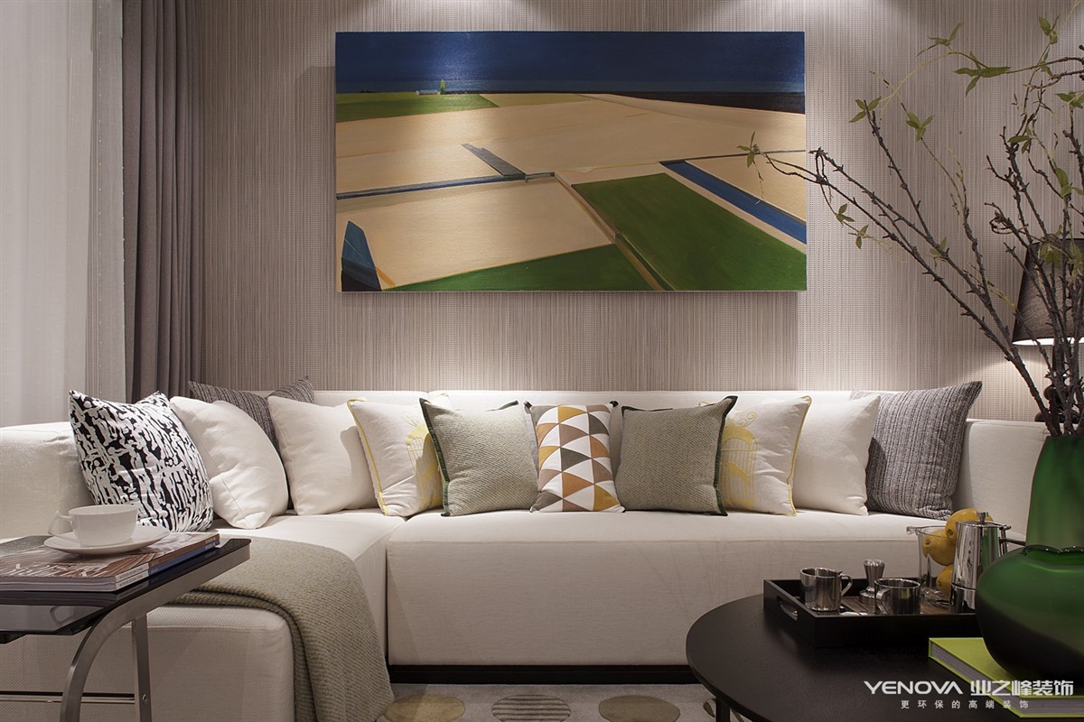 客厅的米白布艺沙发正好呼应了全房的浅棕格调,沙发对面的墙饰也弥补了没有电视的空缺,但也与茶几上的植物做了搭配,仿佛真的身临在大自然中,让人能静下心来喝喝茶,看看书。