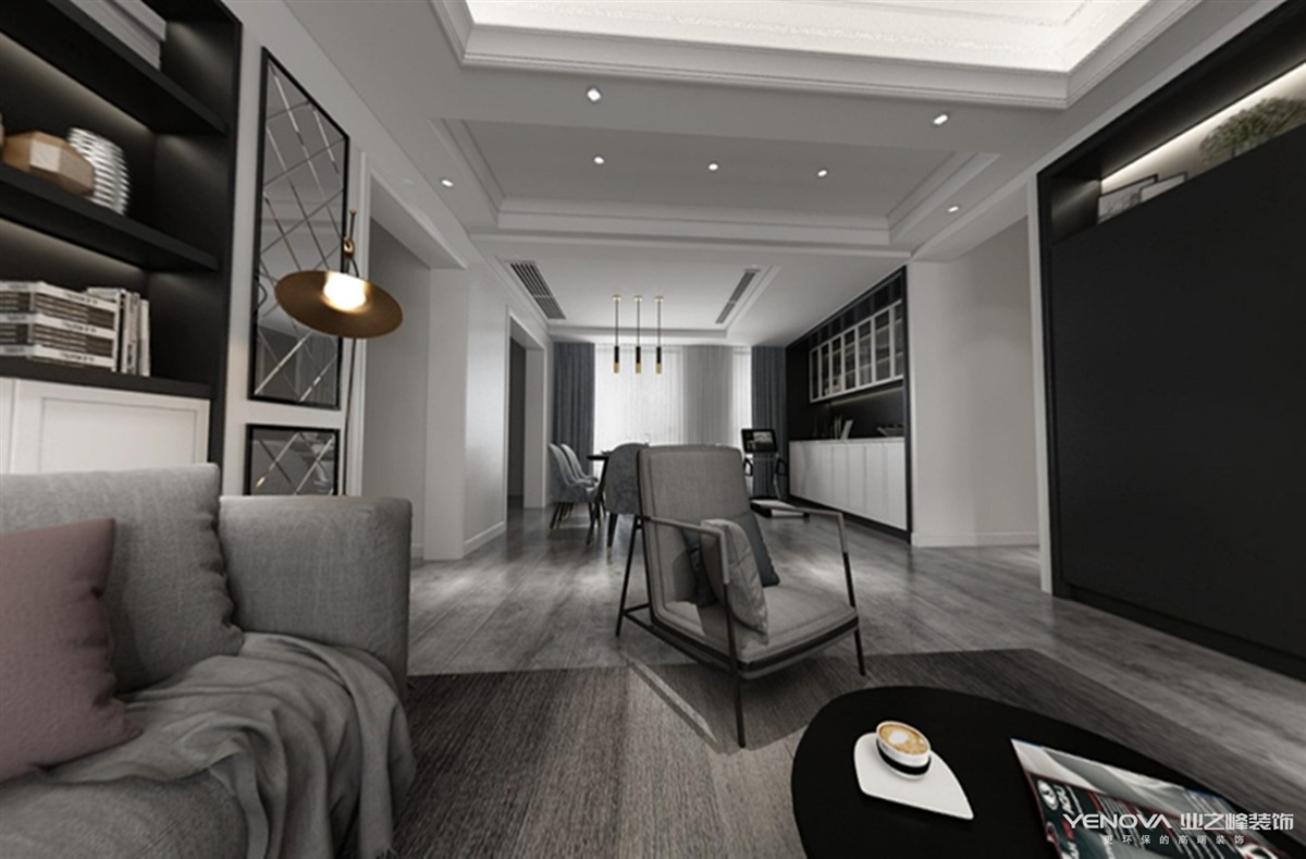 1. 在满足业主对三个房间的需求上,通过对书房及衣帽间的规划,主卧以套间形式增加业主的生活品质,原三个卫生间去掉一个卫生间后,增加了餐厅空间,保证了客餐厅的通透性和舒适性,色调运用上保持了以现代风格的黑白灰特点,形成了大气且稳重的居家风格。