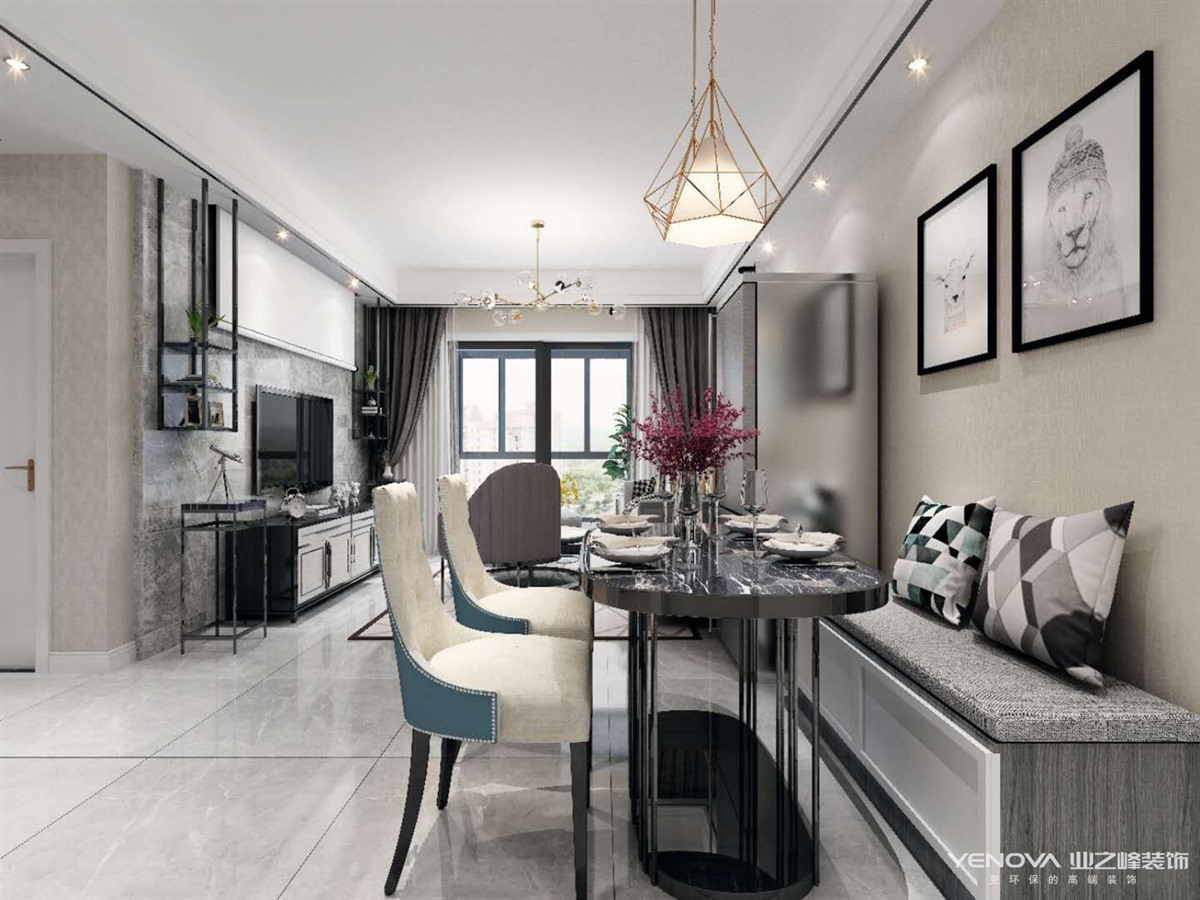 整体色调采用的是暖灰色,地面使用的是灰色仿大理石纹路的地砖,墙面采用的是暖色乳胶漆,电视背景用的是不同纹路色调的墙砖进行不规则拼接,吊顶运用了金属条和石膏板相结合,吊顶的金属线条和餐桌椅,沙发的金属感形成一个整体,相互呼应,不失单调,在定制衣柜的设计上也是结合了整体的色调和材质,柜门设计的是平开门样式,用黑色把手代替了传统五金把手,更有设计感。