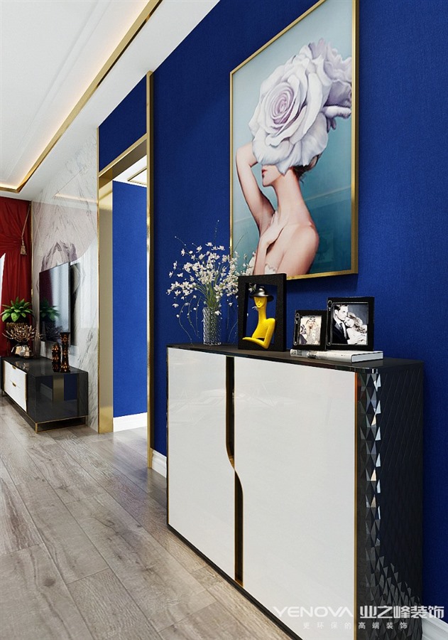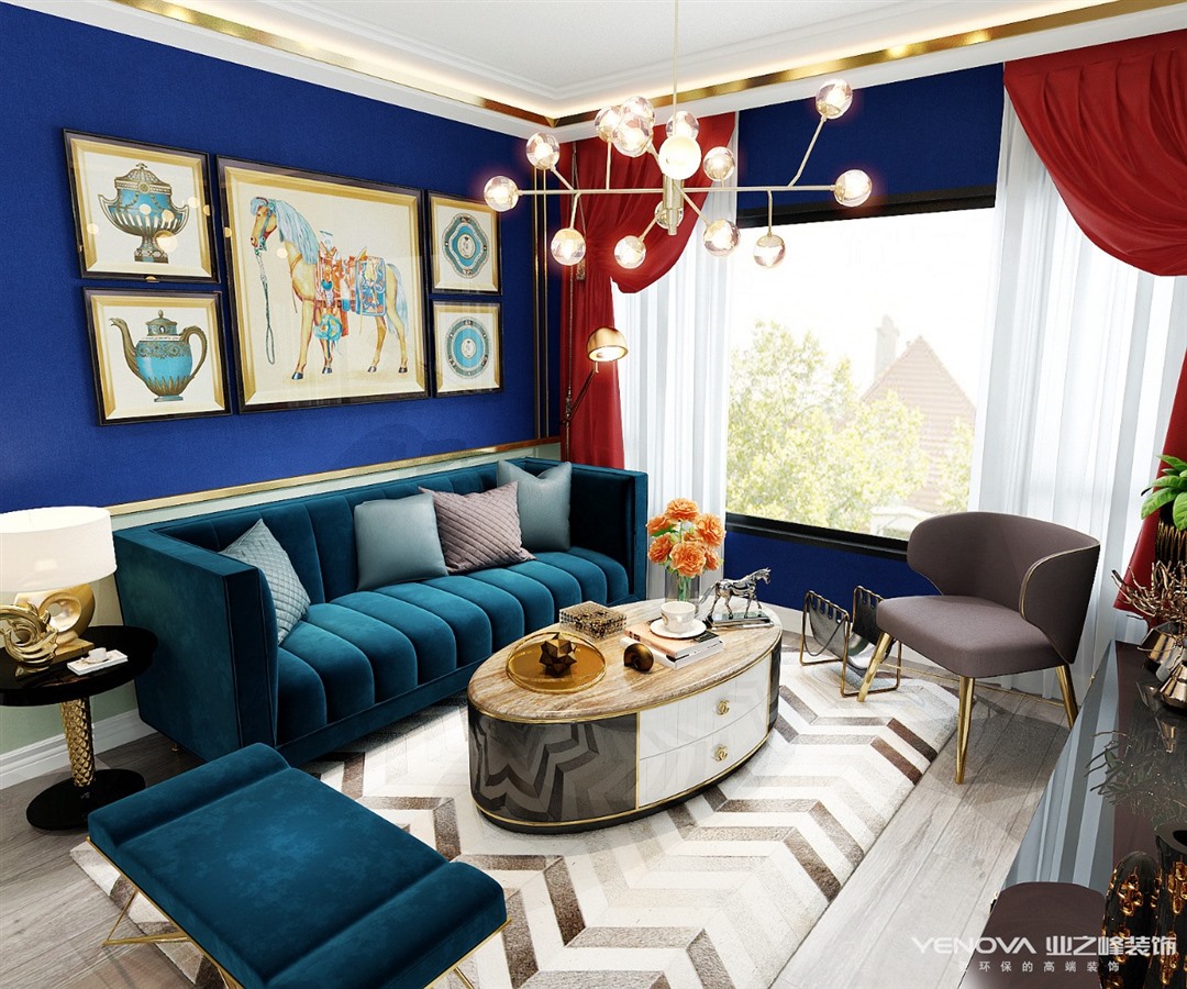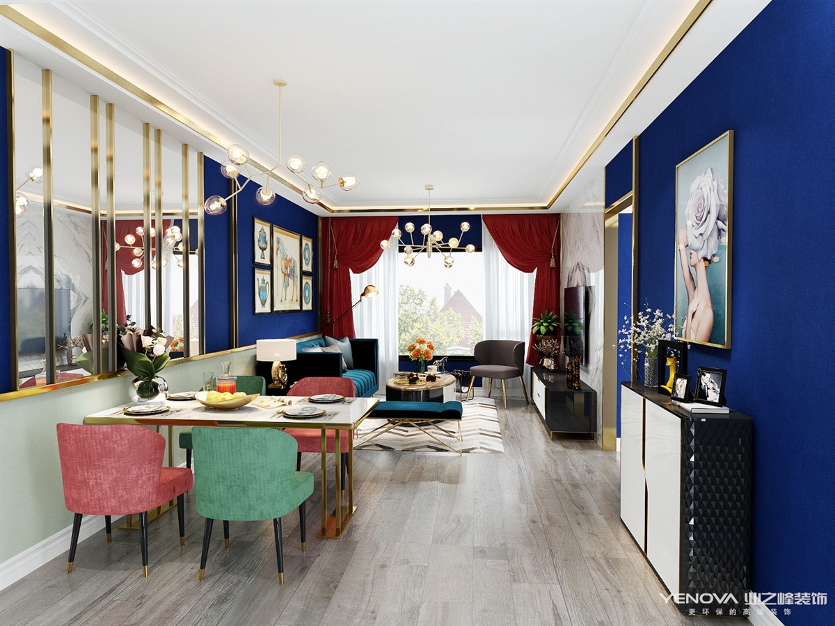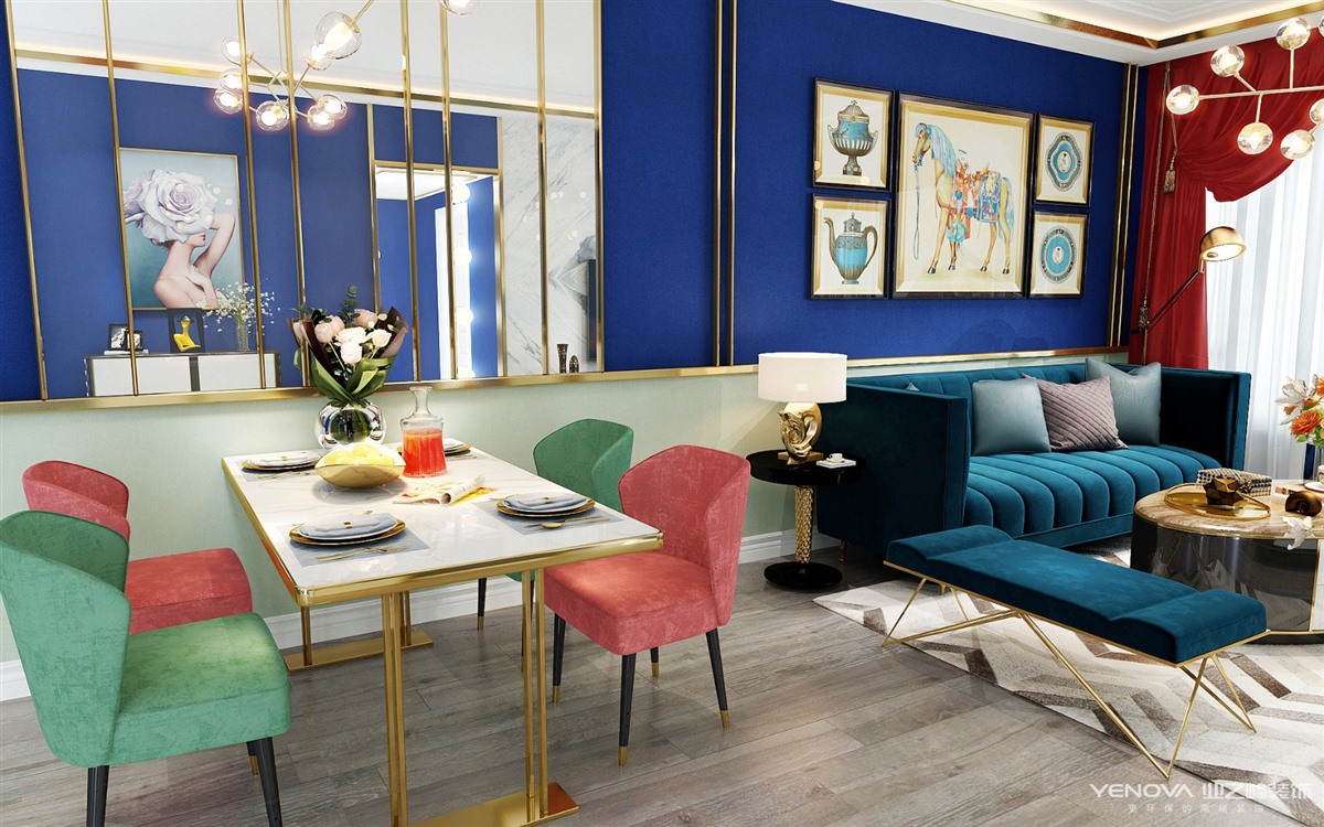 设计不仅仅是风格的体现和表达,风格和材质只是项目的表象。真正能打动客户的是实际的使用功能的满足以及新的生活方式品质的引导。此方案中,客餐厅区域色彩搭配上我们用了孔雀蓝跟红色,给人视觉的强烈冲击,餐厅区域镜面加不锈钢也是整个区域的一大亮点,整体的软装配饰也是具有活力色彩元素,将颜色运用的淋漓尽致。