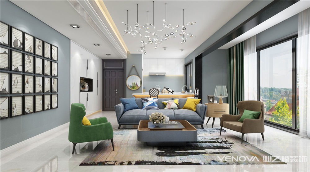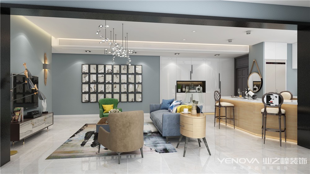 新希望·锦官阁精品设计案例:本案将客户喜欢的一切融入装修,雾霾蓝的墙面,搭上灰色大理石地砖,错杂地铺排,亮点是家具和空间色彩,强烈的混搭感和时尚感呼之欲出,居家环境简洁个性,舒适放松,没有过多的堆砌和造型,由此在设计上主要通过材质和色调来营造一个时尚简洁舒适的居家氛围,开放式厨房大胆解放了原有厨房狭小的空间,从而使整个客餐厅宽敞明亮。
