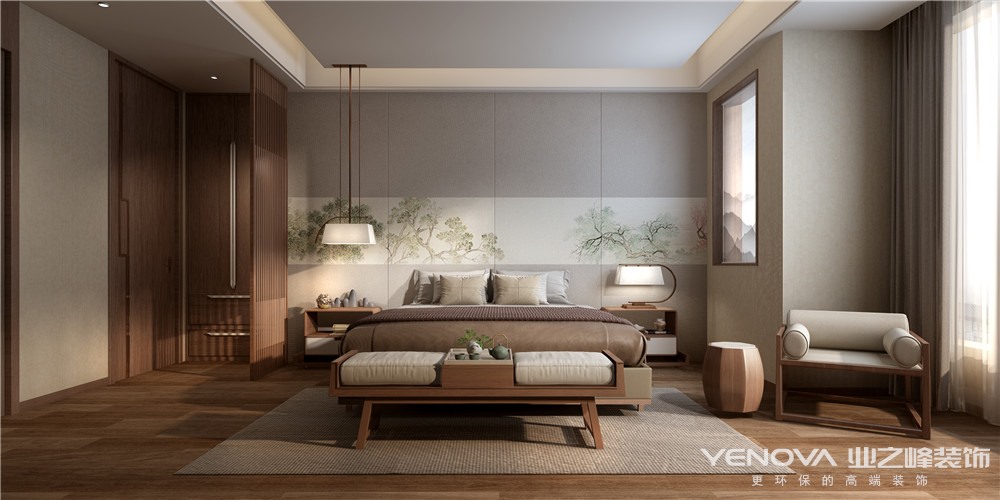 在卧室中不考虑过多的浮夸造型,尽量精炼物件。床头悬挂的中式灯具、柜子上摆放的山峰艺术品、水墨画百叶帘与主卧背景墙相互辉映,使房屋品格纵然提升。在统一中设计师也在不同空间增加了层次,在重要节点营造重点空间,让空间层次显得主次有别,结合区域划分和陈设,让人体验其中的时候有一种“悠然见南山”的闲适之感。