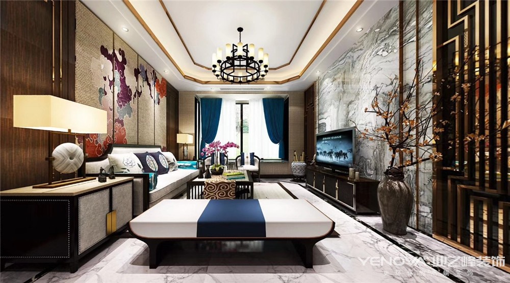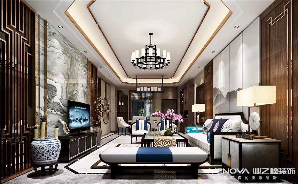 客户为中年大学老师,夫妇两人温文尔雅,谦逊有礼。因此本案定义为新中式风格,用中式的意境烘托客户的个人气质。整体色调为深色,加入石材金属的元素,局部点缀蓝色,体现中式的“新”,希望给客户营造既舒适又有意境的空间氛围。