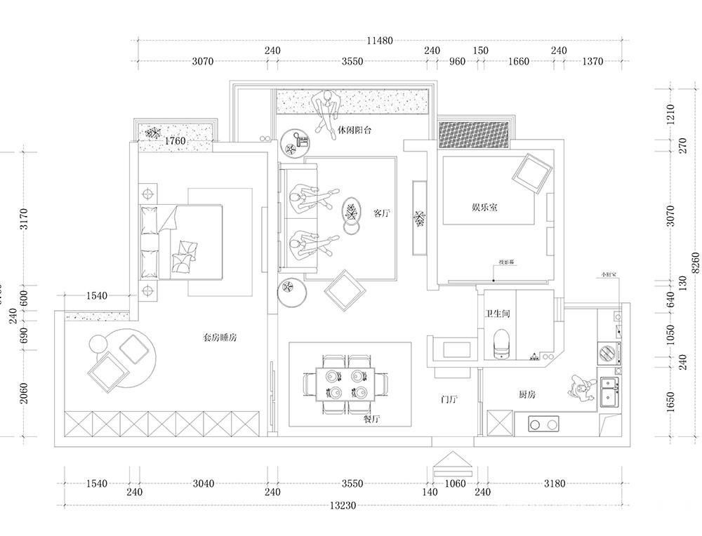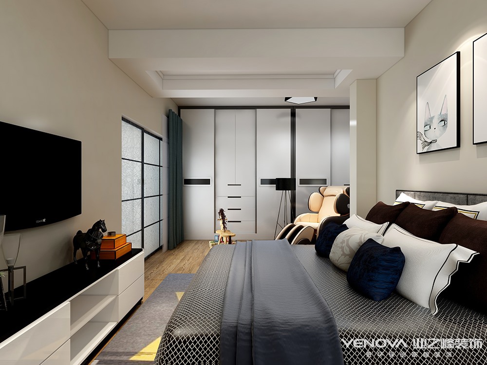 设计说明:本案为两房两厅户型,户型比较规整。本案房所用后期带孩子读书,所以将原有的三房改为两房 ,风格考虑为简中风格 ,后期改造后各区域都比较宽敞复合业主的需求。