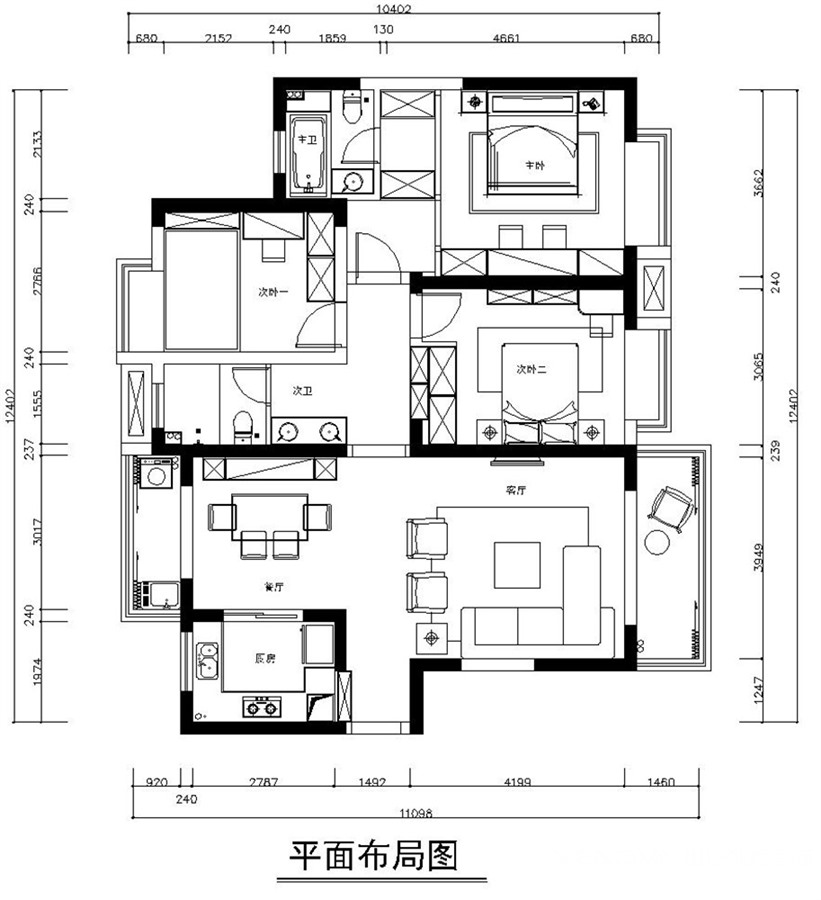 观看整个房屋平面,过道比较长,通过功能去的分工,同时解决了整个房屋过道比较狭长的问题。在主卧的设计中,为了更贴近业主的要求,把主卧的房门做了改动,这样改动的第一个优点是扩大主卧的使用面积,同时也起到一个反冲作用,不会一开门就看到卧床,增加安全感,在床位设计了一个1.8米的书桌,因为业主两个人有经常带工作的回家的习惯,这样设计同时又能保证主卧两面的空间不显得急促。同时还能保证有独立的衣帽间,储物空间能得到充分的保证。