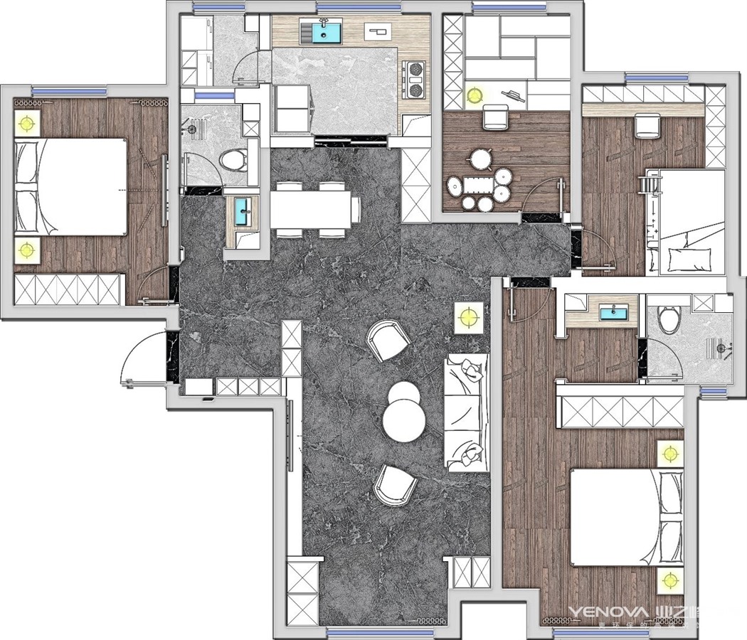 一套有温度的设计,既要经得起时光的历练,也要居住得很舒适,客厅的整体色调偏冷,加上暖色调的装饰摆件以及暖色调的地毯为点缀,显得整个空间的设计更加的走心,设计简洁的沙发和木质的茶几注入,为整个空间增添了一份特别的气质与温馨,让居住者感受到更为舒适的家居生活。户型图