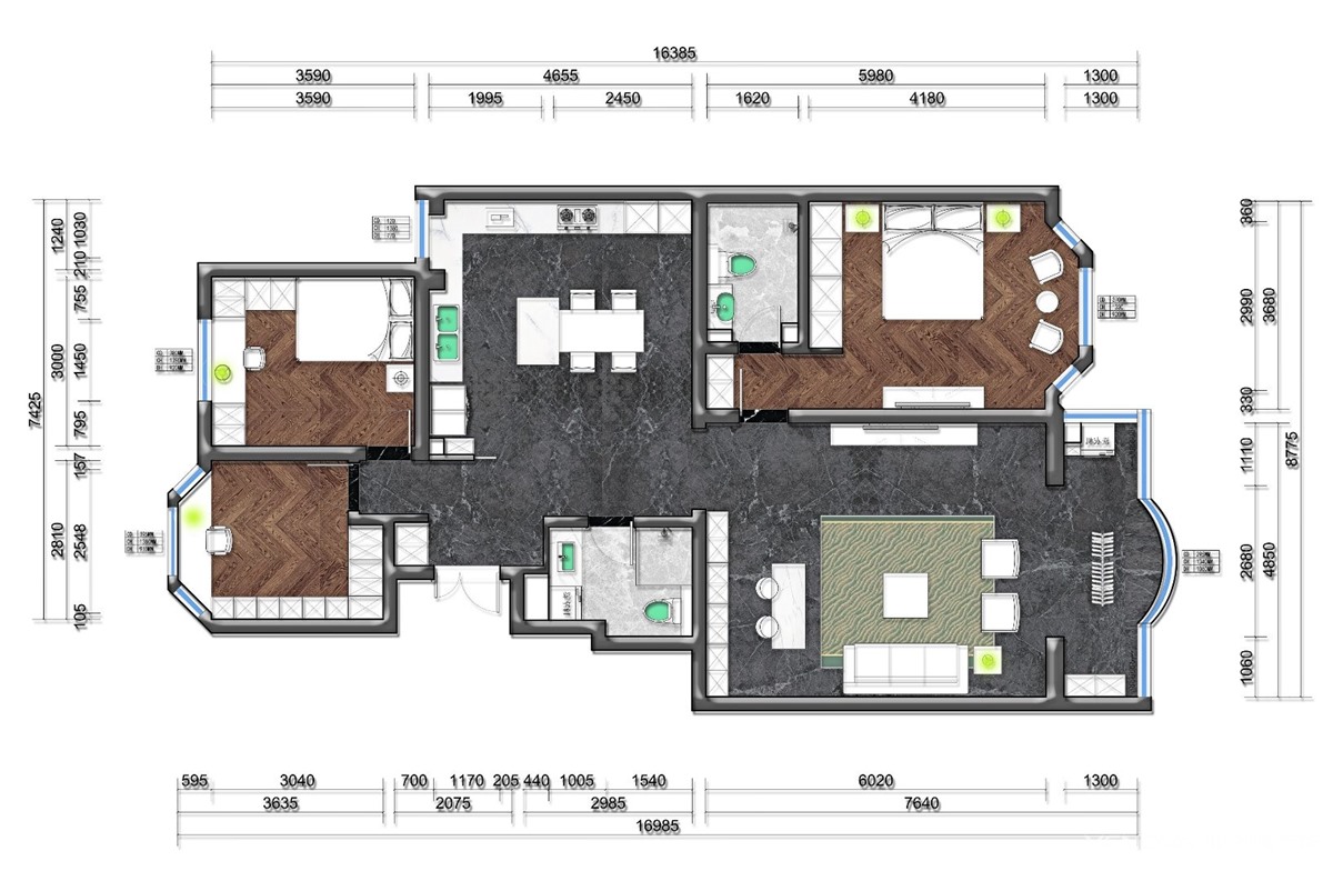 一套有温度的设计,既要经得起时光的历练,也要居住得很舒适,客厅的整体色调偏冷,加上暖色调的装饰摆件以及暖色调的地毯为点缀,显得整个空间的设计更加的走心,设计简洁的沙发和木质的茶几注入,为整个空间增添了一份特别的气质与温馨,让居住者感受到更为舒适的家居生活。地面为了便于小孩光着脚丫踩的舒适性,设计师为业主采用了实木复合地板,整套配色与浅色家具呼应相得益彰,显得空间既有情趣,又凸显出非常有品质的居住氛围。