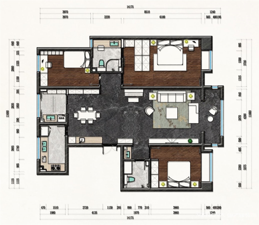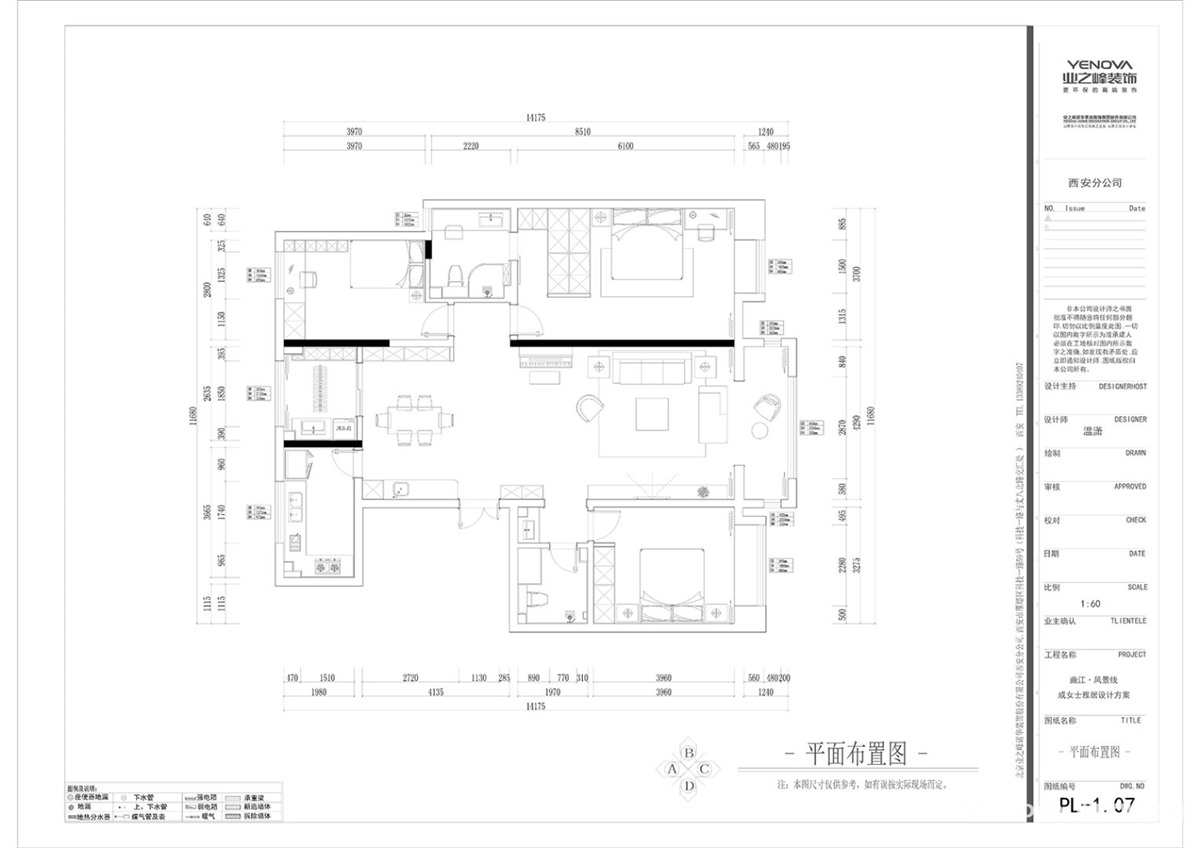 此户型为三室一厅居室设计占地面积总共140多平方米,要满足三代人同时居住,因此在设计上有很大的难度,而设计师采用的时尚现代简约风格可以很好的表现此空间的完整性,在小空间里面找到属于自己的空间其中很多设计上更具有人性化,使空间更实用,功能性更大,在设计上,让一个狭小的空间变的具有大空间、透光性较好等特点;在施工工艺上,安排得更加合理;在颜色搭配上,给人以低调、高雅、神秘的感觉。