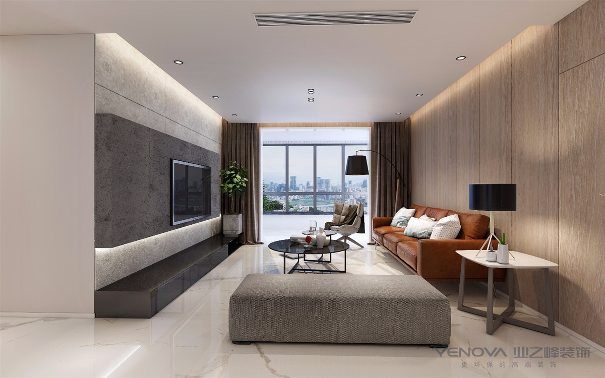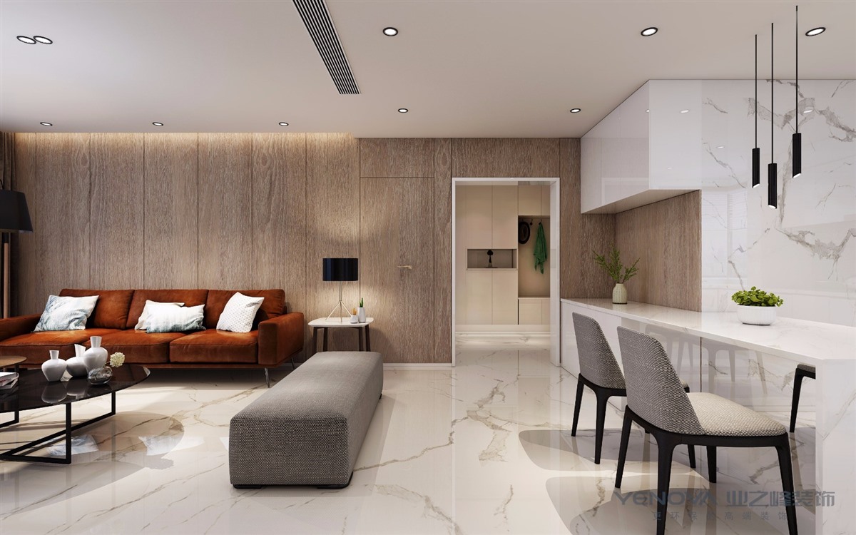 极简风格,感官上简约整洁,品味和思想上更为优雅。客厅顶面的整体设计是平面吊顶,没有主灯,做的是点光源的设计,地面用的是爵士白的大砖,客户比较喜欢整洁的空间,没有过多的造型,化繁为简整体用来灰色、白色、原木色区分空间,用橘色的沙发作整个空间的点缀。