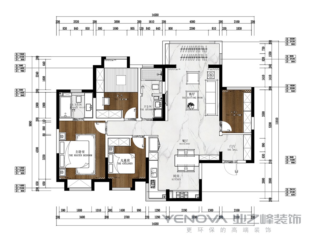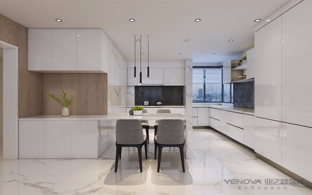 此户型南北通透,南边是客厅和阳台,北边是厨房和洗衣房,经过和客户的沟通,客户比较喜欢的开放式厨房还喜欢把台的感觉,所以把洗衣房墙拆了,做成了一个大的厨房,厨房和餐厅的区域做了一个吧台,厨房的整体颜色使用了爵士白的瓷砖以及白色的烤漆免得橱柜,整个空间比较干净整洁。