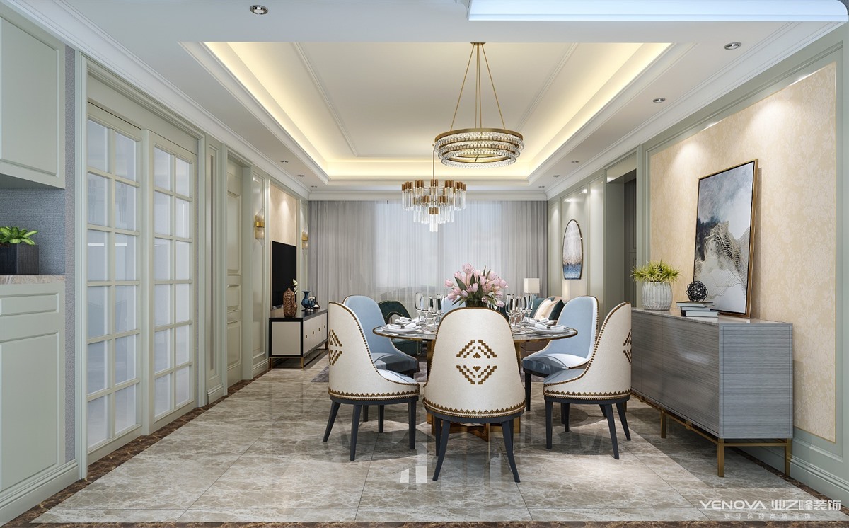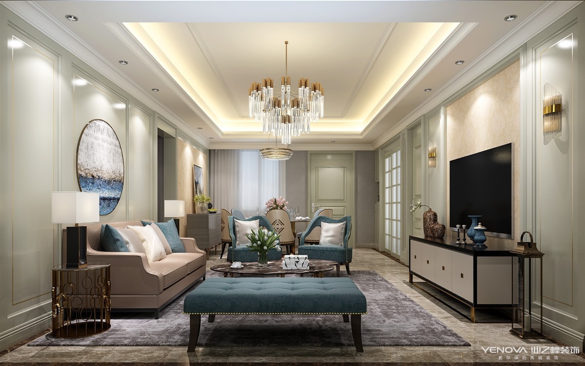 本案色调以烟灰绿色坐稳中庸,再将其他色彩有度展开,希望以打造品质与独到的生活美学为初衷,调和轻奢与素雅的冲突,以现代生活需求为考量,展现和谐的生活美学。