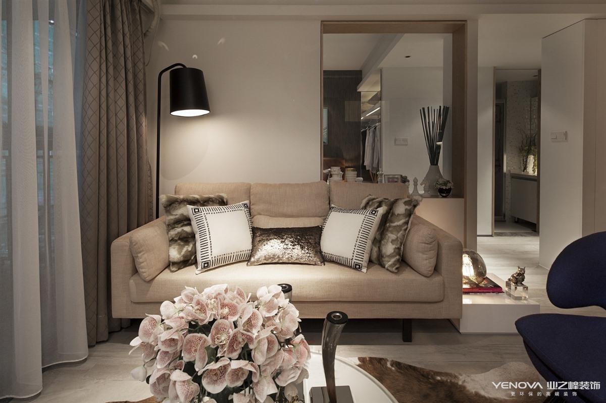 了大面积的白墙,沙发选用布艺的,再以盆景加以点缀,整个色彩干净剔透,在设计上也以简单为主,不加一点的繁多琐碎。掬一捧清晨