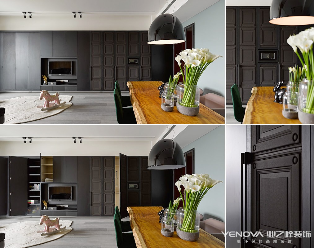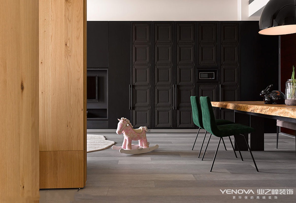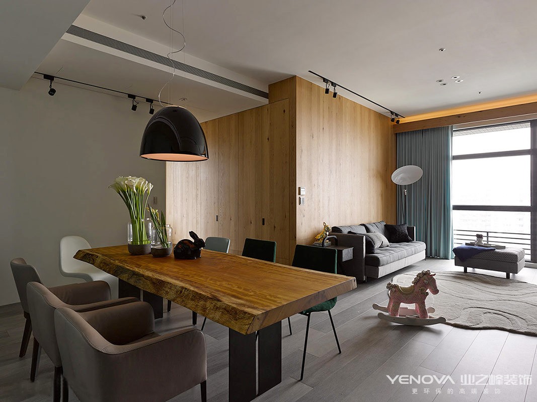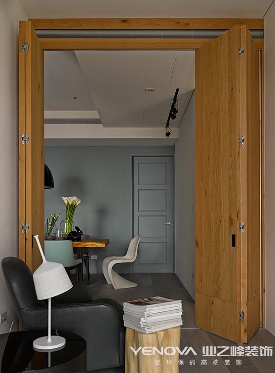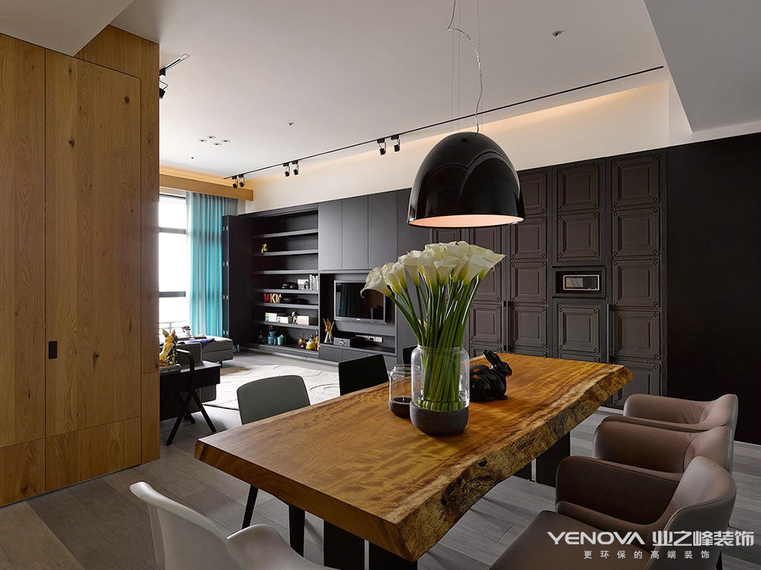现代设计追求的是空间的实用性和灵活性。居室空间是根据相互间的功能关系组合而成的,而且功能空间相互渗透,空间的利用率达到最高。空间组织不再是以房间组合为主,空间的划分也不再局限于硬质墙体,而是更注重会客、餐饮、学习、睡眠等功能空间的逻辑关系。通过家具、吊顶、地面材料、陈列品甚至光线的变化来表达不同功能空间的划分,而且这种划分又随着不同的时间段表现出灵活性、兼容性和流动性,如休憩空间和餐饮空间通过一个钢结构的夹层来分割,阁楼上的垂幔吊顶又限定了床的范围,这是典型的现代空间设计手法。