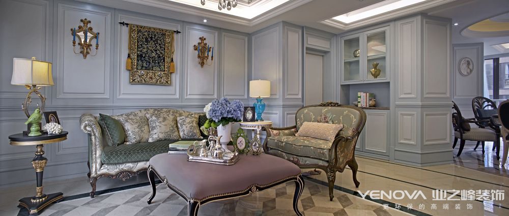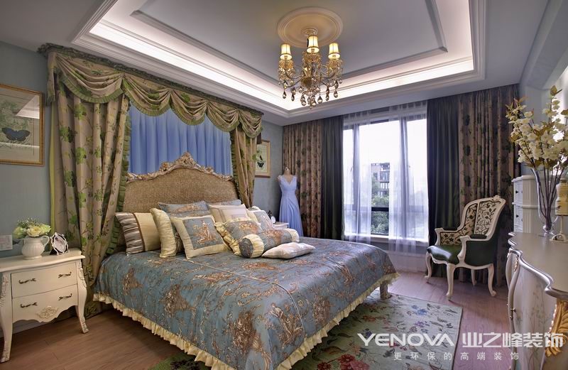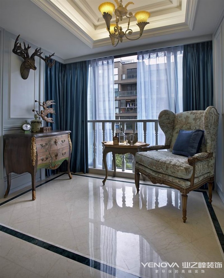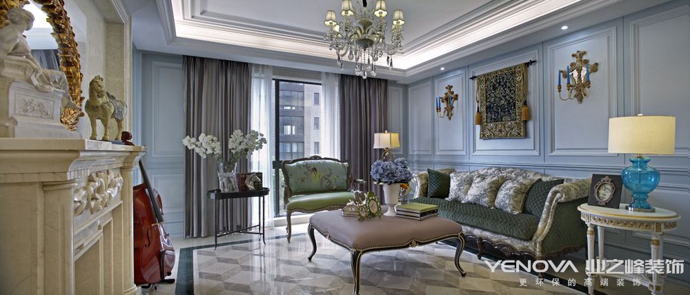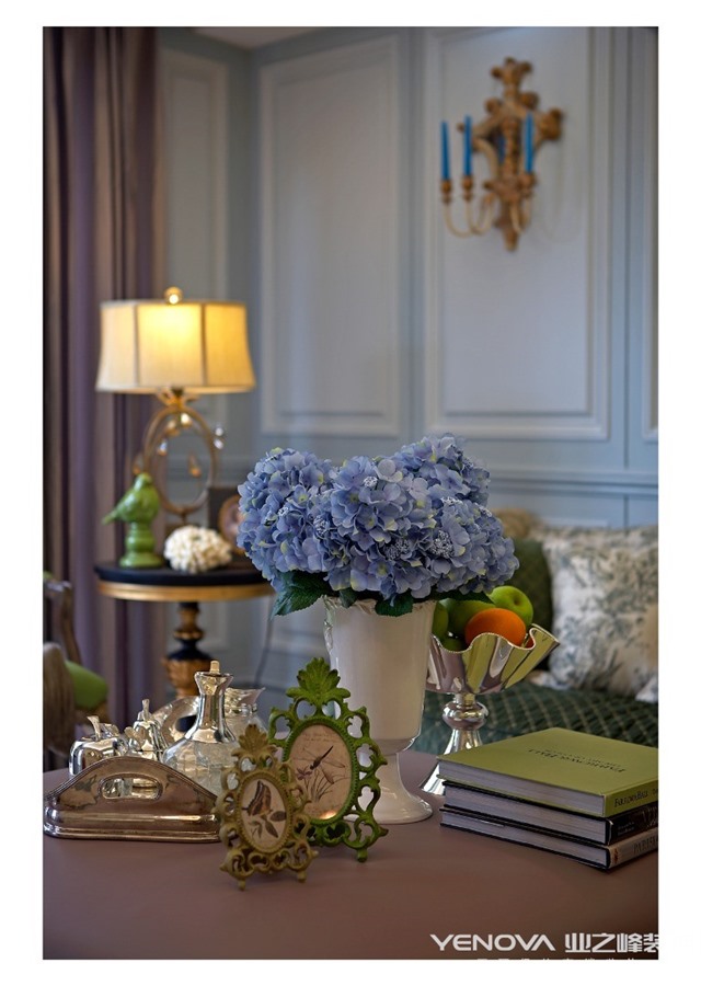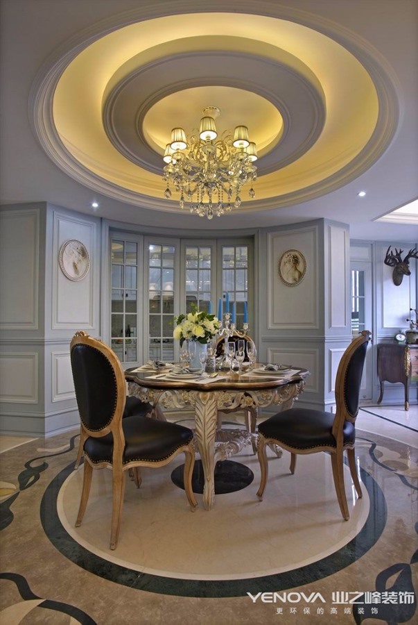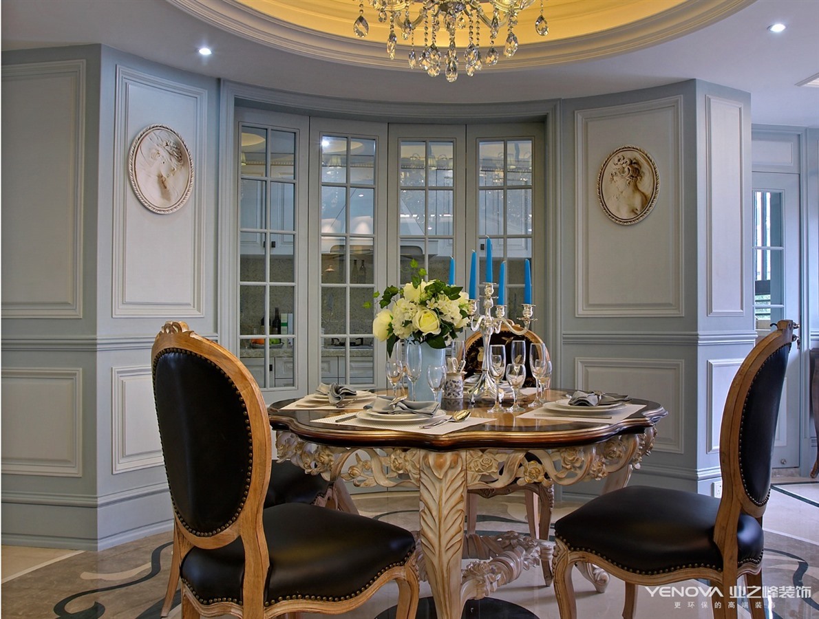 贵族风格,高贵典雅。巴洛克式的木质雕花,白色的卷草纹窗帘、璀璨的水晶吊灯、饱满的花艺搭配,形成浪漫清新的法式空间。