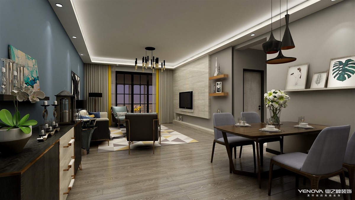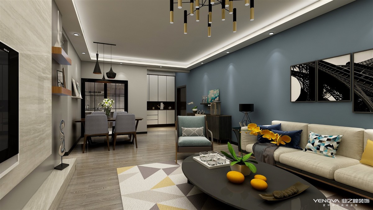 整个空间以高级灰为基调,辅以简单、大气,提升空间优雅、大方的氛围,并且点缀上热情活泼大气的蓝色黄色作点缀,营造出优雅、大气的生活空间,感受家的温暖。