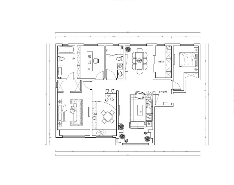 设计风格以因设而设,精在体宜为主;宜是其核心概念和价值标准,一是因地制宜,二是简而不繁,三是自然。在空间设计上采用简洁硬朗的直线条。直线装饰在空间中的使用,体现出了简单的生活居住要求,迎合了中式家具内敛、质朴的设计风格,使空间更加实用、更富现代感。在传统中式家居风格的现代生活理念中户型图