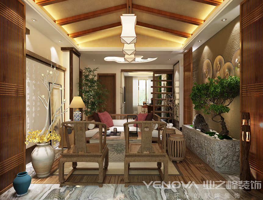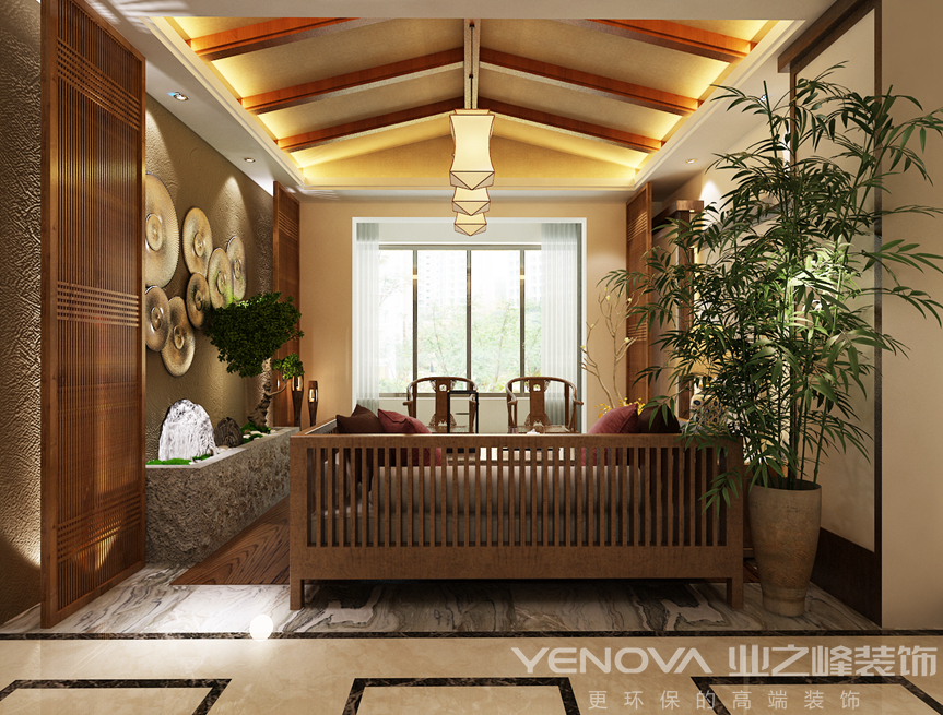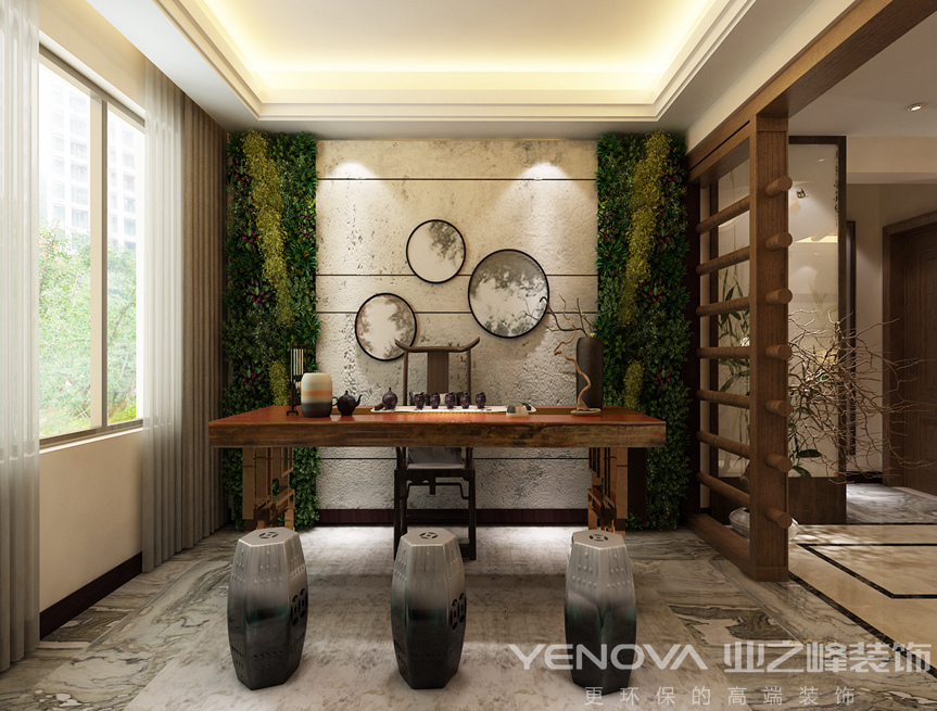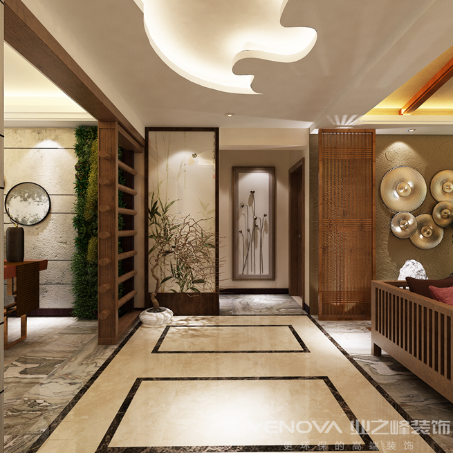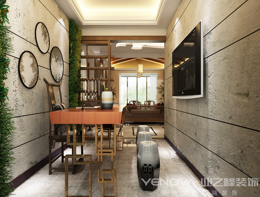 《归·本》 – “静若清池、动则涟漪” “归·本”—回归生活本源。是回归人的本质,是回归生活最自然的状态。设计归根结底是对生活的发言,是对人生的探索。“草木荣枯自由时、万物从容皆自得”,面对世事变迁生命无常的淡定从容与舍我其谁的人生态度,进则天下、退则田园的进取与淡薄。这是设计师意图为现代人们所呈现的境界,为滞留于此的人们传达静谧、深邃的气质,坐享于此,一本书、一杯咖啡就拥有胜过千言万语的释然。 室内的空间布局一气合成,氛围和谐统一,自然与考究的材质肌理与富有感召力的色调搭配,令视觉上悦目、赏心。现代设计语言中揉进富有质感的传统元素,赋予空间灵气,升华空间艺术情境,蕴涵温文尔雅的气质。灰镜面的邂逅,使整个气氛更显洁净有致,有种“静若清池、动若涟漪”的底蕴。在这般如此的栖息之所,人们获取的是一份甘霖、滋养与力量,开始与自己的灵魂对话,在时光的打凿中永不褪色,沉淀生命的厚度……
