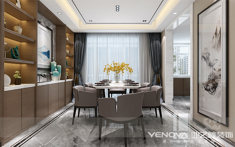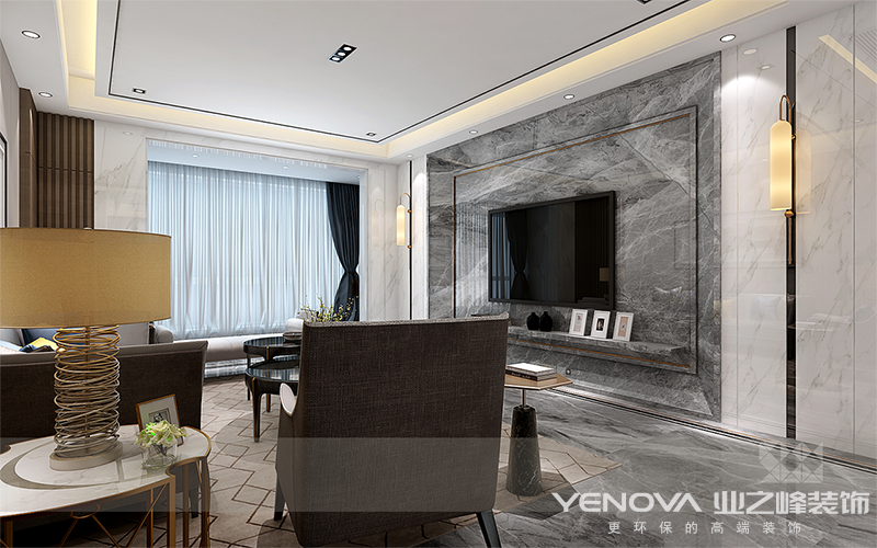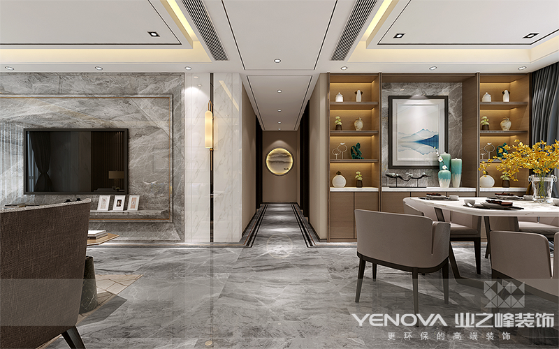本案例为过度住宅,业主希望以现代港式设计的简介、舒适的精神境界追求,在其中加入休闲元素,使整体设计更为简洁舒适,做到行散而神似。石材、木材、金属、硬包的混搭塑造出空间丰富的美感,挑高的吊顶,大面积的落地窗,让客厅看上去更加宽敞。电视机背景墙使用大理石与实木两种不同纹理、不同材质的组合简约又时尚,质感十足。餐厅区整体以暖色色进行分割,靠墙餐边柜的设计隐藏了大量收纳空间,同时为空间增加了层次感。简约的餐桌椅,渲染出简单舒适的氛围。无吊灯的设计时尚简约,整个空间的各项搭配合理而又有层次。
