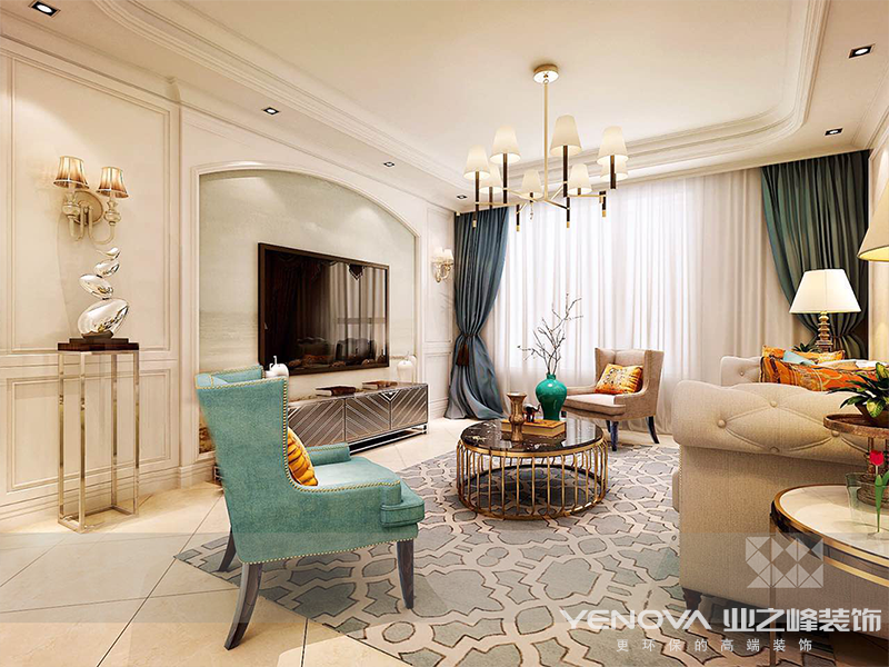 本案例为三代同堂,业主希望整体的功能布局合理,储物量充足,整体装饰不希望太繁琐,以简洁,轻快为主体设计。在设备上考虑中央空调。空间的整体色调以暖色为主。客厅属于动态区域,在整体的功能布局利用最大化。客厅的地面未铺设拼花,以简单为主,在墙面和顶面的造型上也没有使用过多的装饰手法,整体以线条和壁纸搭配为主,使整个空间在装饰上保持统一。在色彩的搭配上以暖色调为主,冷色调为辅,达到整体色调上的协调。餐厅在满足正常的使用的同时,增设了一组餐边柜,在装饰的同时,缓解空间内的储物压力。在整体造型上与客厅部分保持统一。