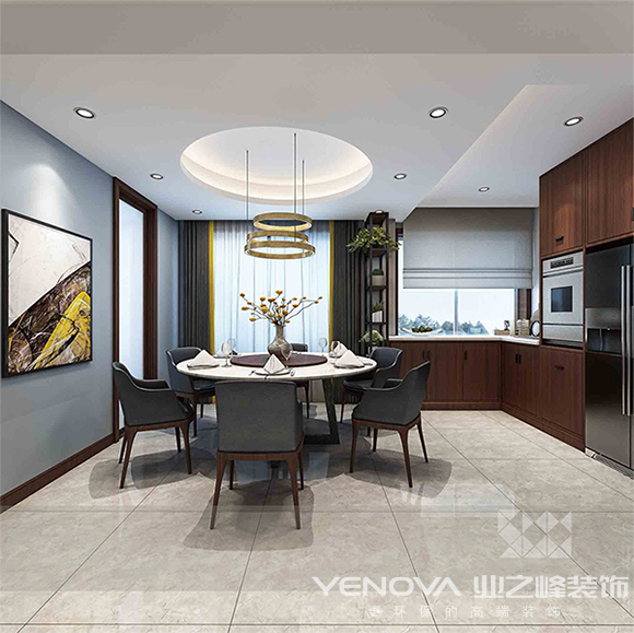 本案例为客户一人居住,业主希望整体的功能布局合理,储物量充足,整体装饰希望以简洁、和谐为主体设计。在设备上考虑中央空调。空间的整体色调以暖色为主。客厅属于动态区域,在整体的功能布局利用最大化。客餐厅的地面地砖通铺,以简单为主,在墙面和顶面的造型上也没有使用过多的装饰手法,客厅电视墙设计了展示柜和装饰灯带,与沙发墙的造型形成统一。开放式厨房使得整个空间大化利用,餐厅的圆形吊顶设计与圆形餐桌使得更和谐。餐厅与厨房的交界处设计了一个置物架放置一些绿植,显得整个空间富有生机。