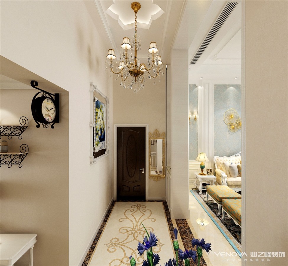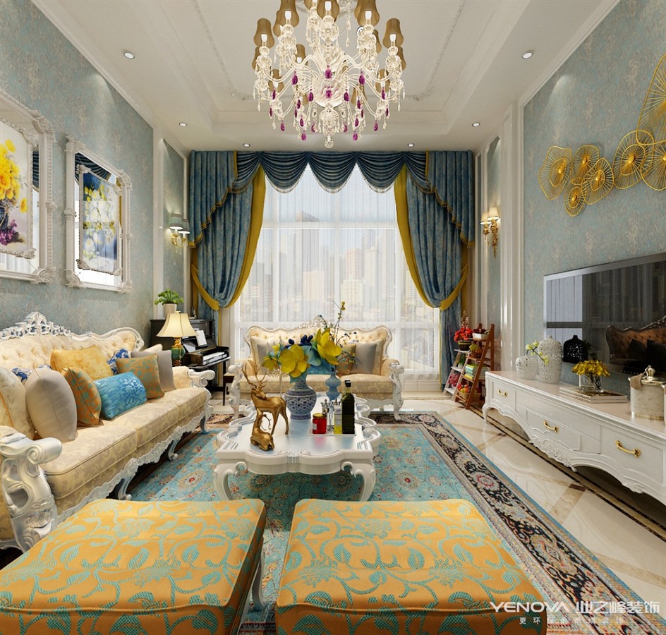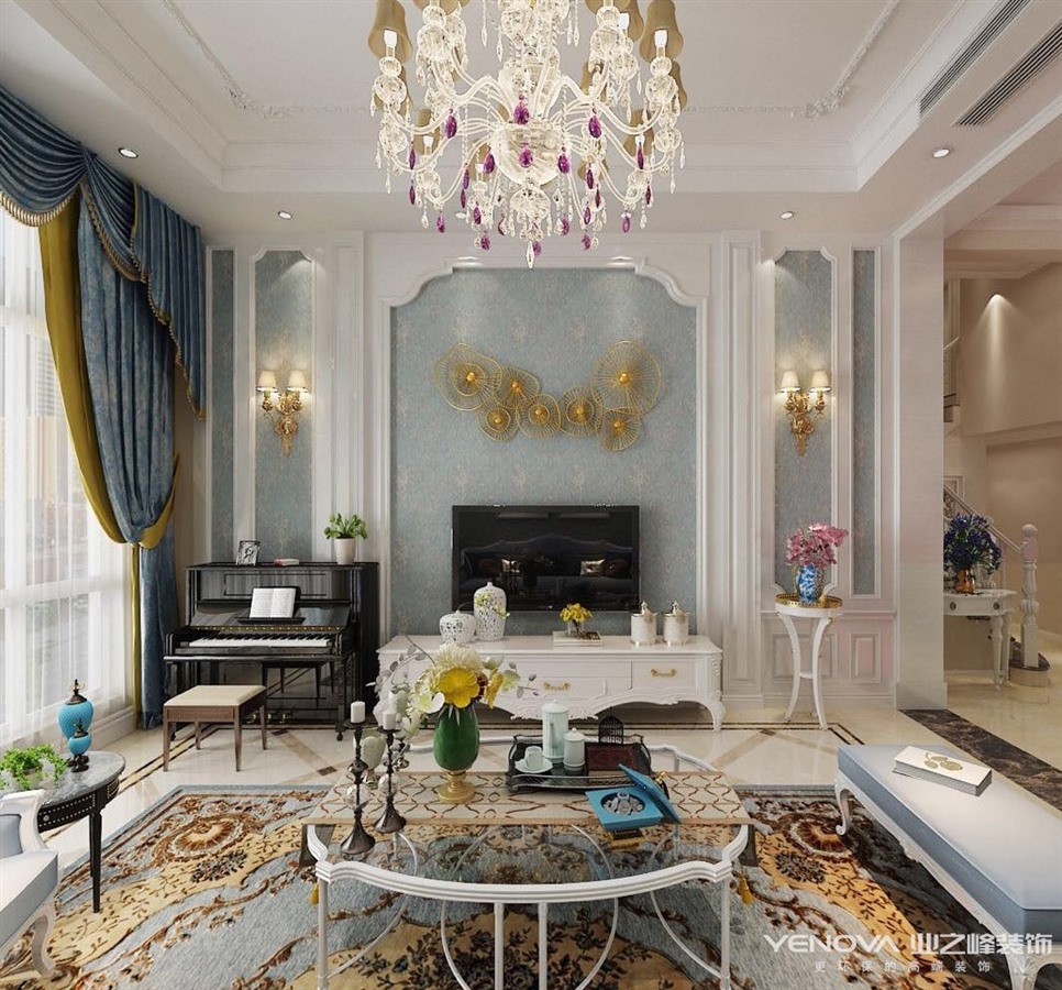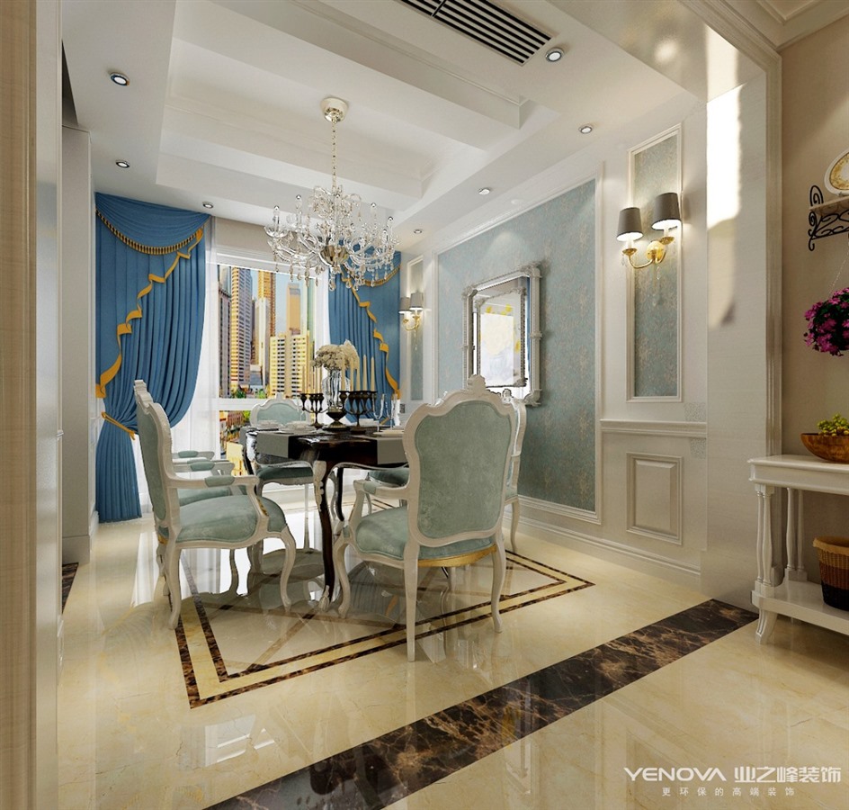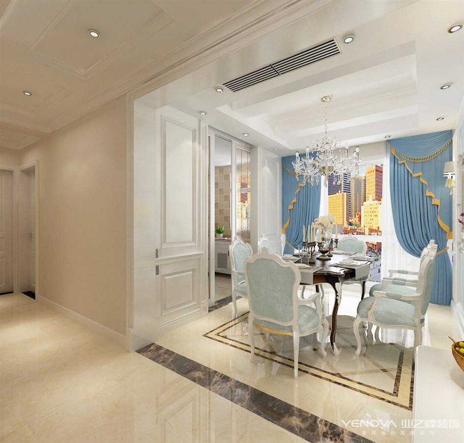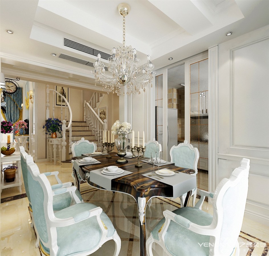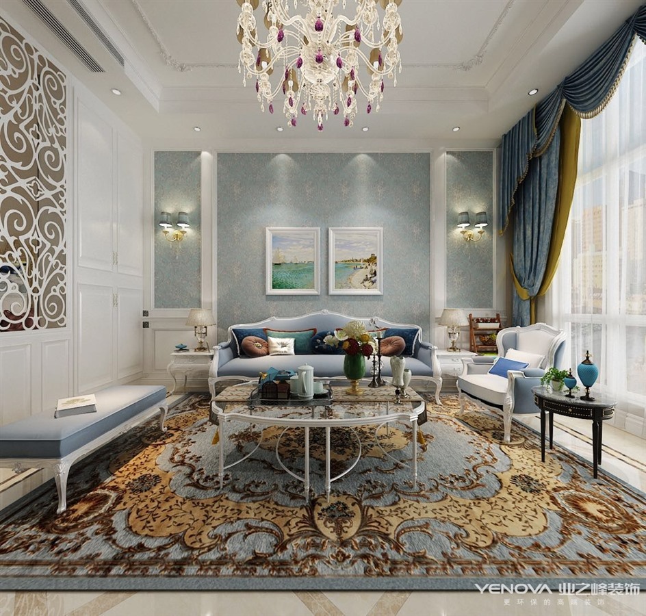 本套方案采用浪漫古典的法式风格,白色的墙板,蓝色的壁布,雕花的石膏花盘,以及华丽的水晶吊灯,将空间用色彩肌理进行装点,体现精致典雅的空间环境。