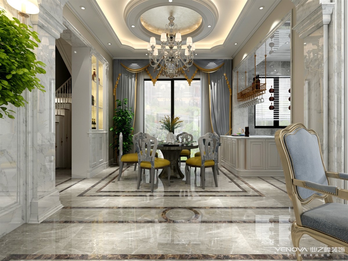 业主是一位对生活有着丰富幻想的女客户,她喜欢唯美浪漫的空间,于是,这套别墅采用浪漫的法式风格,餐桌和餐椅均为米白色,表面略带雕花,配合