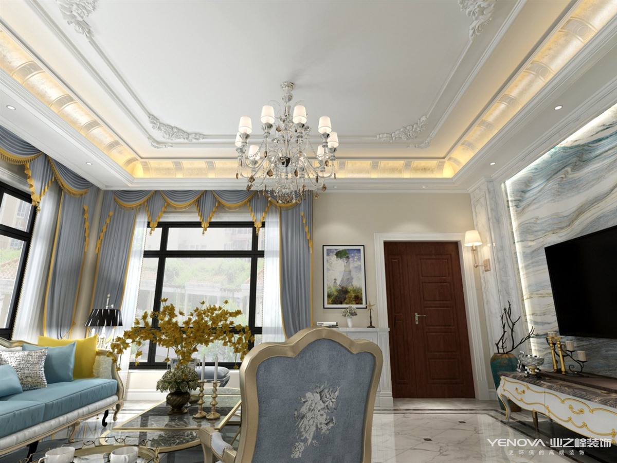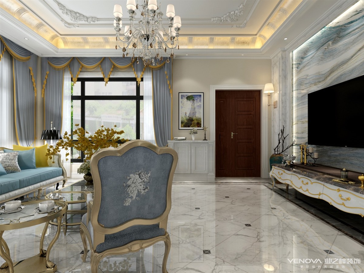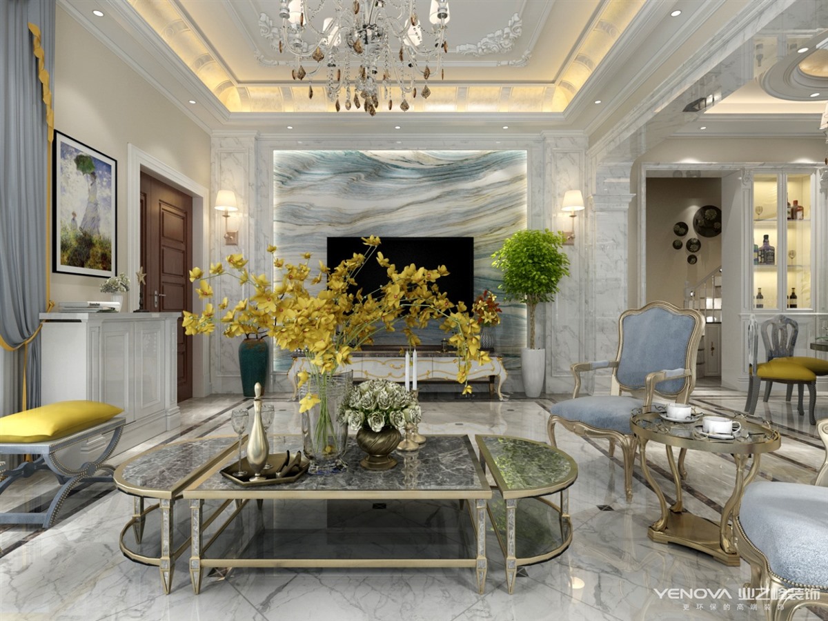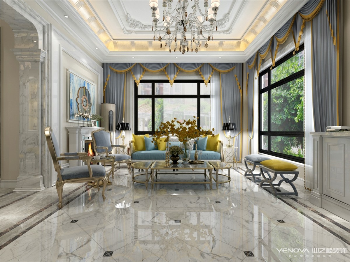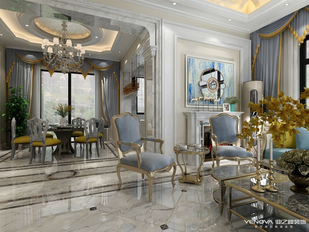 扶手和椅腿的弧形曲度,显得优雅矜贵,而在蓝黄搭配的窗帘、水晶吊灯、壁炉、瓶插跳舞兰的搭配下,浪漫清新之感扑面而来。空间处处体现着高贵唯