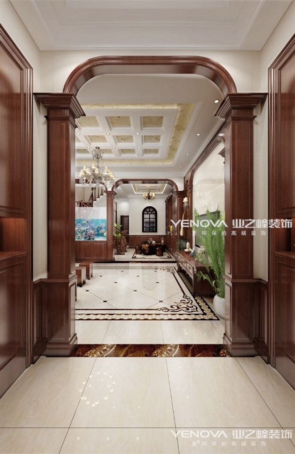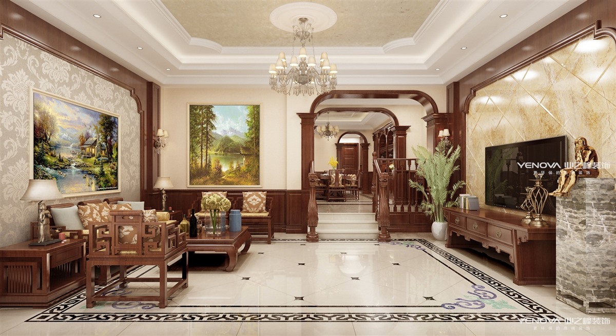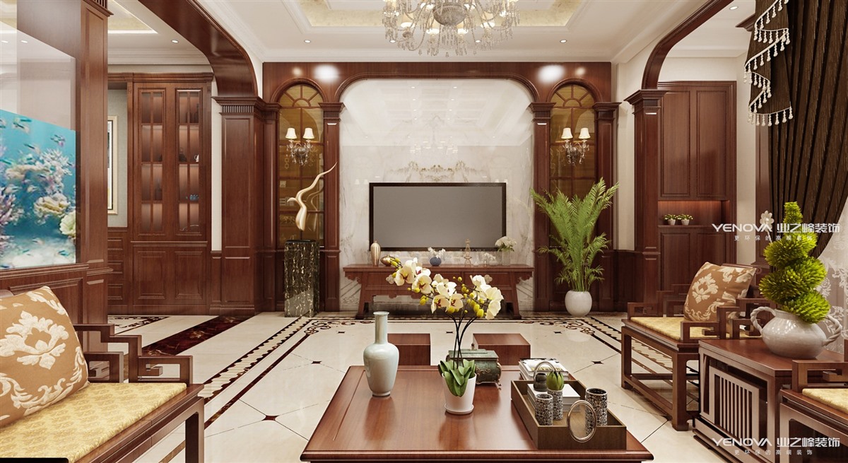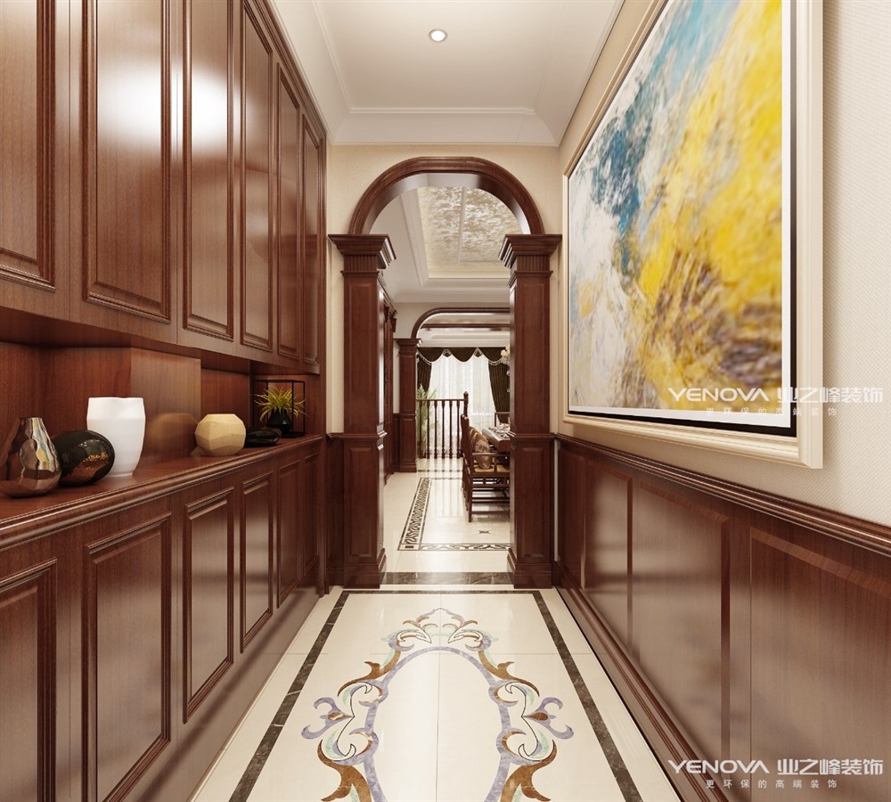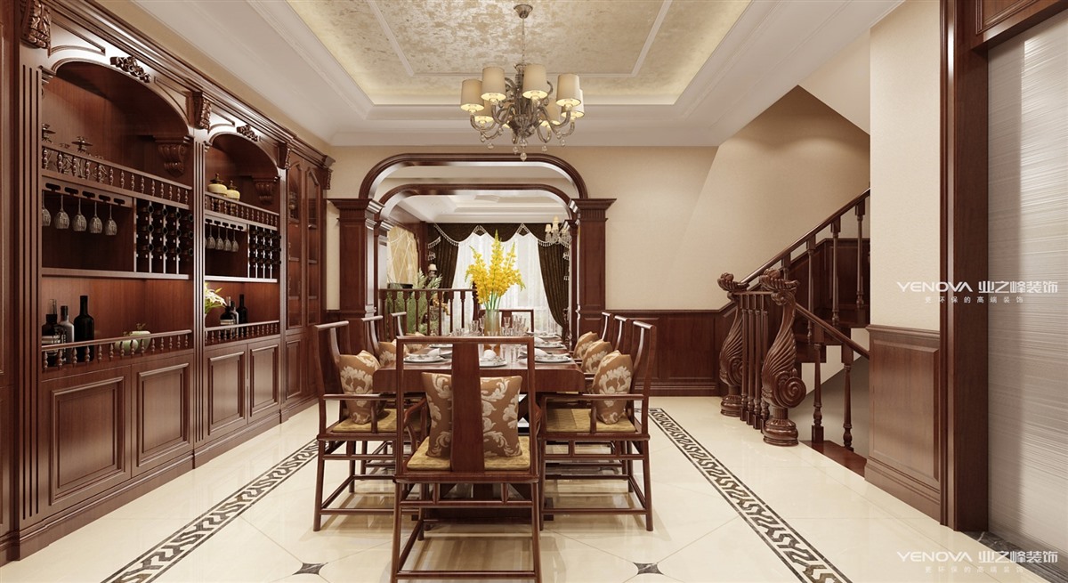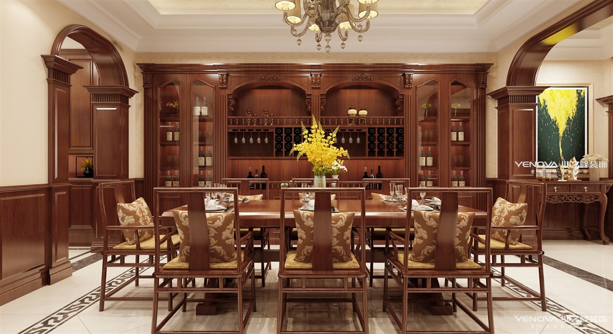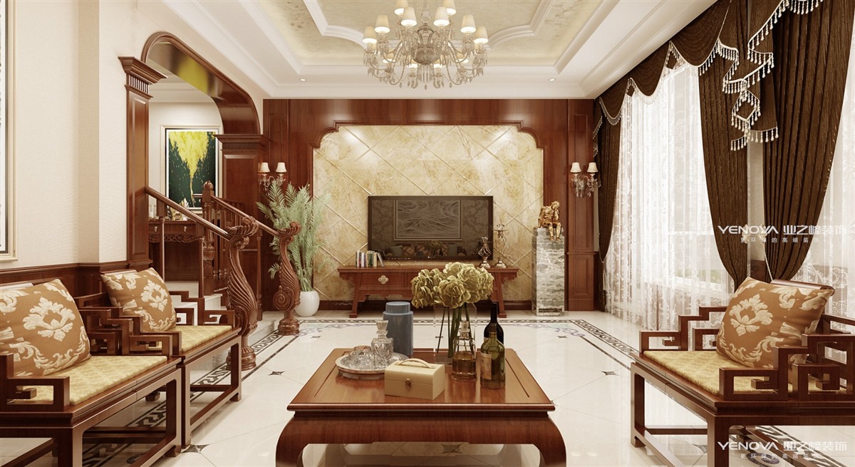 传统中式家具的古朴韵味,欧式风格的浪漫情怀,二者的相结合,打造出一个富有韵味又时尚精致的温馨空间。全屋使用木质定制家具,从材质和尺寸做到设计的整体吻合。古典的中式家具,桐木色欧式造型墙板,天然的大理石背景墙,米色格调的壁纸等装饰织物的布置,传统与现代,时尚与经典,奢华与质朴,繁复与简约,这些看似相互矛盾的东西,其内在却又有着紧密的联系。以东方美学为根骨,融入西方的居住风格,东情西韵,抵挡不住的混搭魅力。