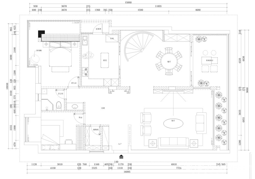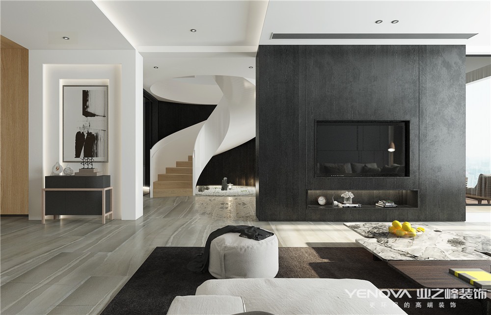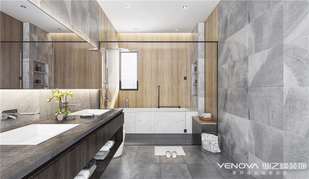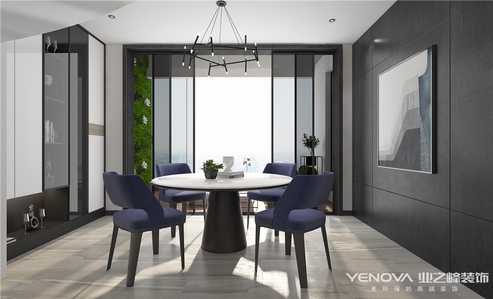 设计师说明:明与暗、需与实。设计师采用大面积灰色大理石配上明度相对明快的木色调点缀空间,使得整个空间轻松、简明、随和、温馨、时尚。粗矿纹理的家具配上现代的餐椅让空间别有一番品味。这些丰富了空间色彩层次,彰显了设计师追求细节品质,使得空间温馨但是又不失时尚和品味。