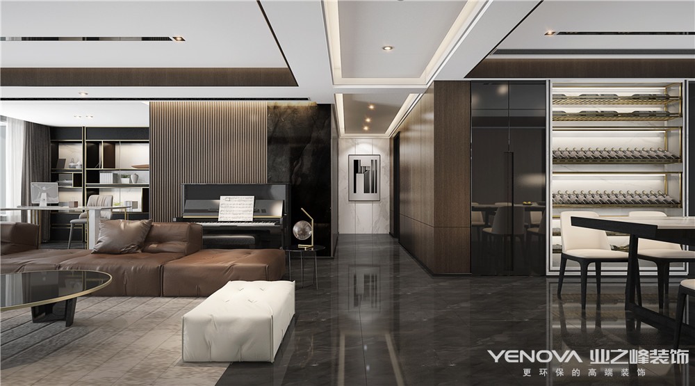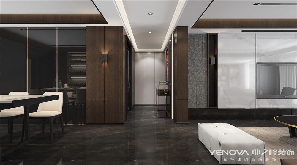 极具设计感的现代空间,搭配黑暗中透着冷冽的壁面,材料运用上使用了天然木皮,原木散发的质朴结合石材的自然纹理、传达出室内外的平衡共生,希望在纯净空间里,让居住者从视觉、嗅觉、听觉、味觉与触觉的感知中放松身心。