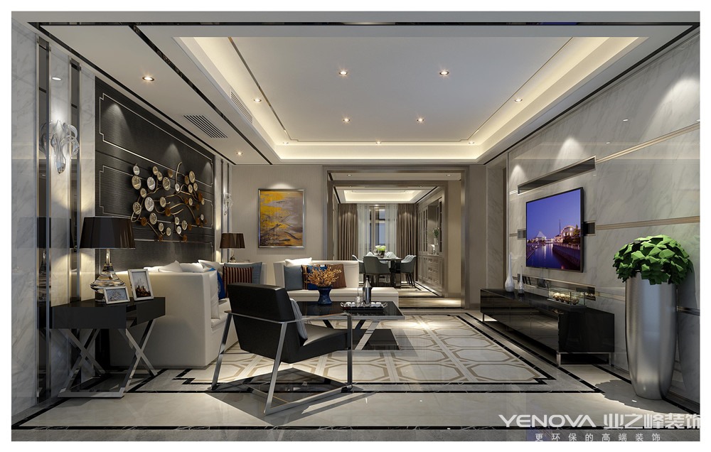 本项目色彩上打破现代格调的常规,以黑、白、灰为基调打造空间,软装饰以经典的几何图形镶嵌空间,并在此基础上注入了国际时尚的流行元素,注重工艺,追求细节。材质上以石、钢、木、皮经典的材质转换,表达了一种时尚耐看的新装饰主义。