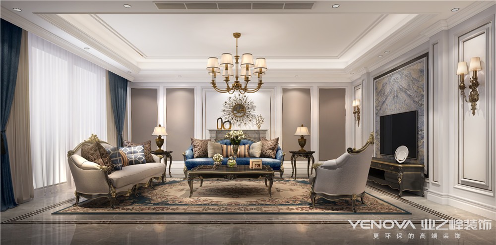 美式家具的设计的重点是强调优雅的雕刻和舒适的设计。在保留了古典家具的色泽和质感的同时, 又注意适应现代生活空间。客厅作为待客区域,整个空间简洁明快,同时装修较其它空间要更明快 光鲜,通常使用大量的石材和木制的家具来进行装饰。