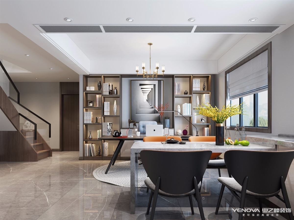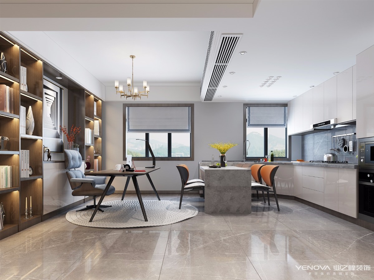 由于业主一家极少做饭,所以负一楼厨房作为开放式厨房,餐桌跟橱柜连为一体分隔空间,