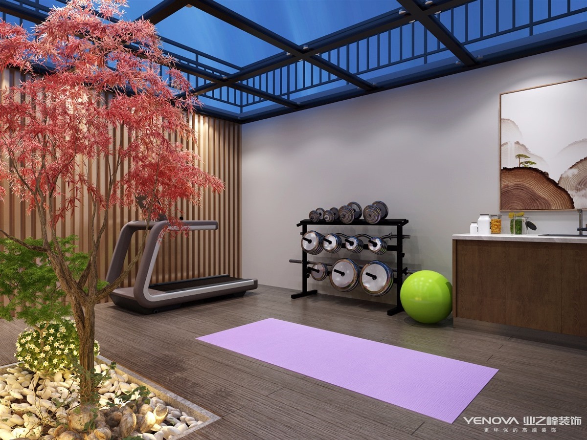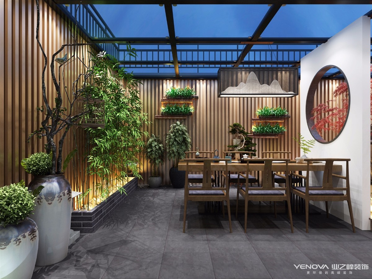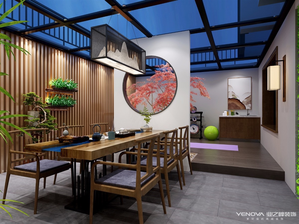 负一楼采光位置搭建钢架玻璃顶,单独采用新中式风格做出一个极其舒适的休闲空间,正所谓移步异景,此方案完美将现代与中式风格相结合,得到了业主的极度认可。