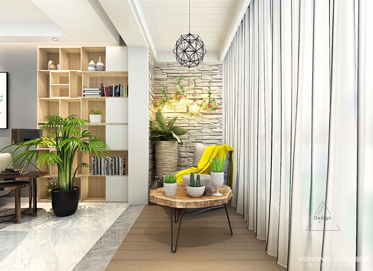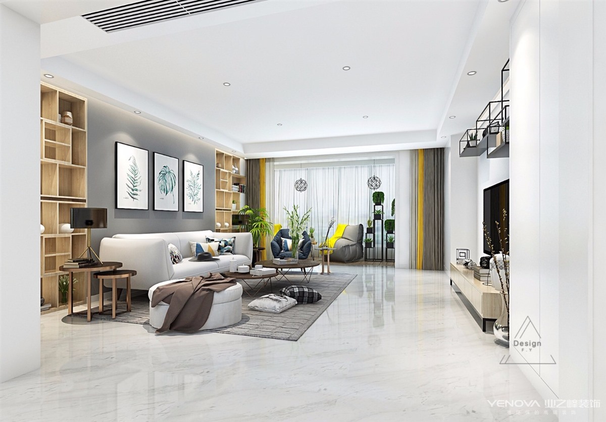 【区域设计说明】客厅属于动态区域,在整体的功能布局利用最大化。客厅的地面采用鱼肚白地砖,使整个空间看起来更加干净整洁,在墙面以灰色乳胶漆配合原木色家具,使整个空间在装饰上保持和谐。在色彩的搭配上以冷暖色调结合,达到整体色调上的协调。