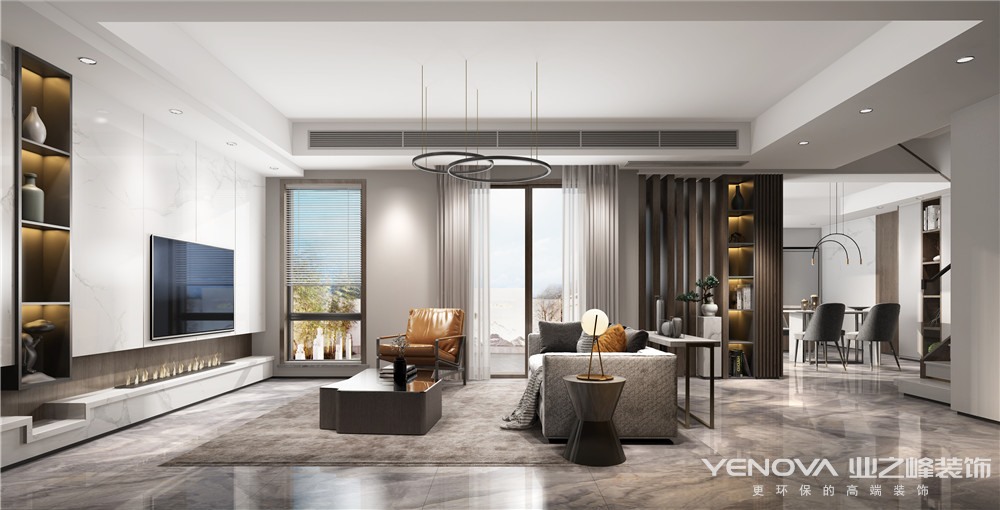本案设计风格为现代新中式风格。是中国传统风格文化与现代时尚元素的融合和碰撞,本案设计重点是客厅餐厅的互通和交流,开放式厨房更加增加了空间层次感。色彩上采用柔和的中性色彩给人大气优雅、自然脱俗的感觉。现代与新中式的融合既凸显了房子设计的时尚感,又不失新中式的文化底蕴。