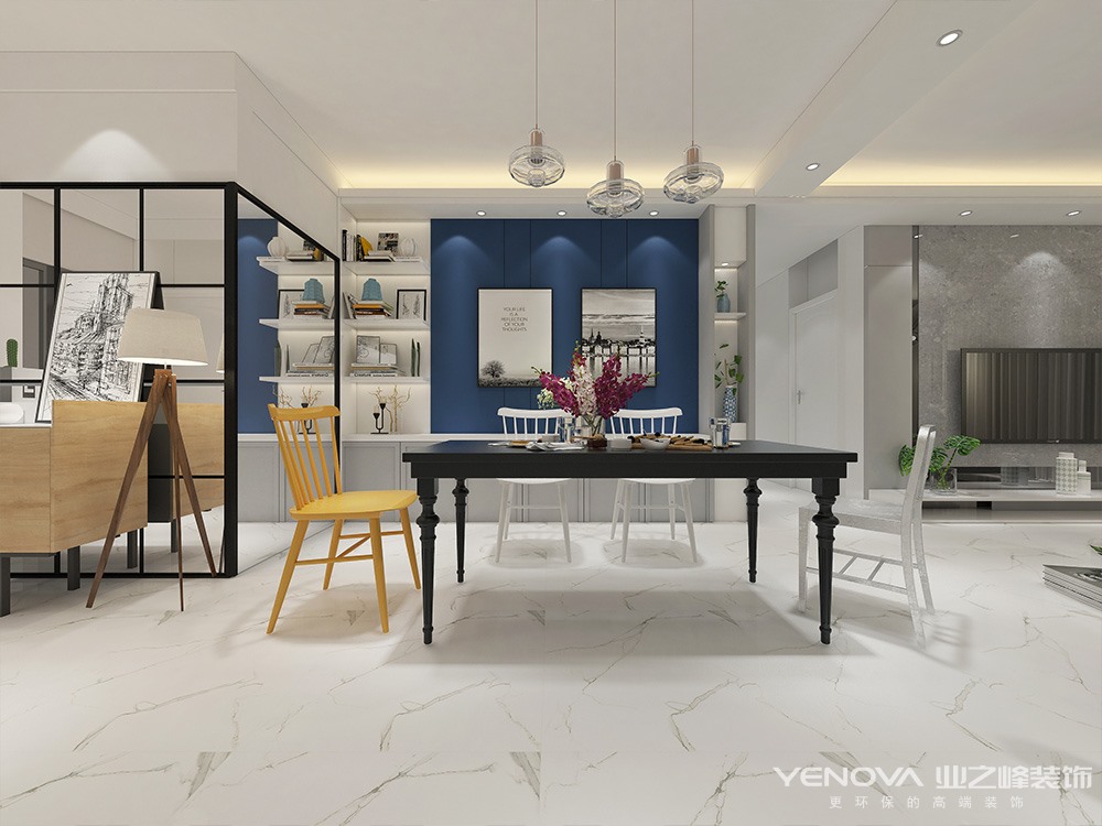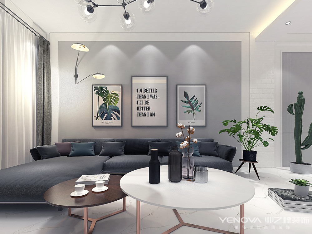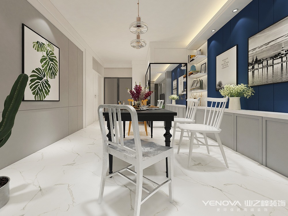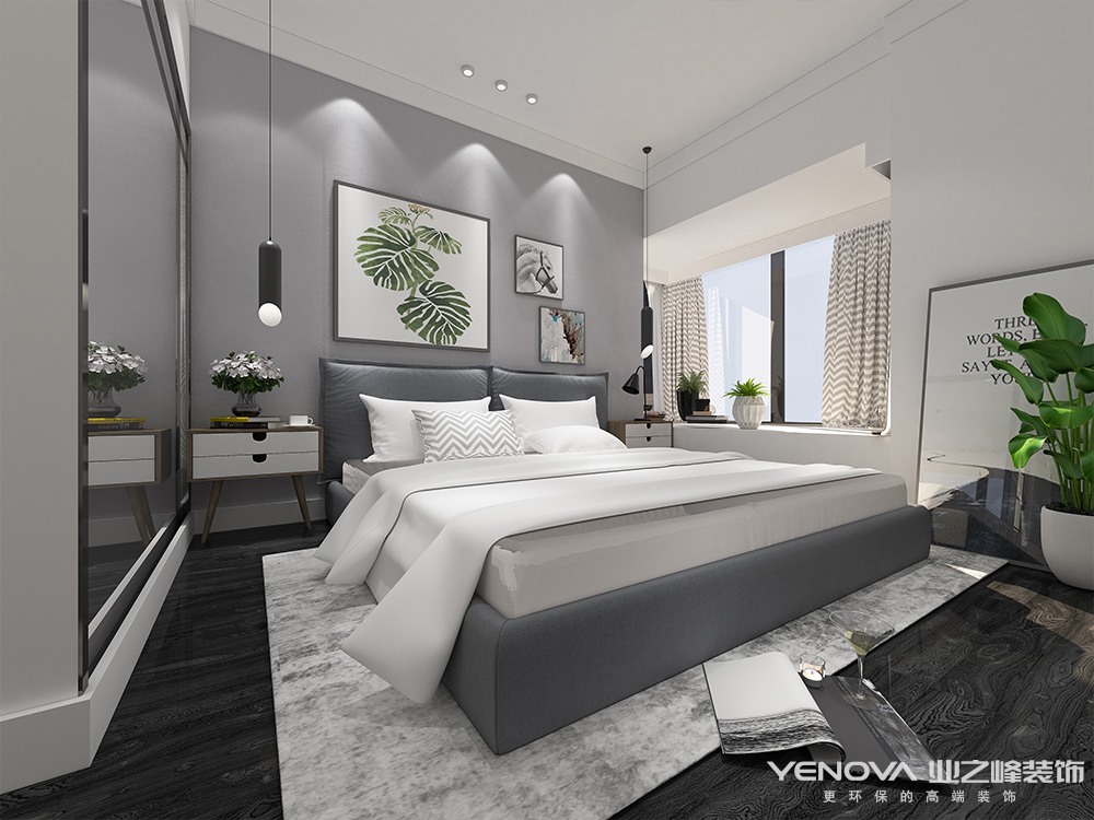 设计说明:在北欧风格中,搭配源于以白色为主色调,用鲜艳的色彩加以点缀。大面积的使用白色能使空间变得干净纯粹。方案中采用了色彩鲜艳的背景装饰画和盆栽植物作为视觉冲击点,空间层次感一下就丰富了,这就是家居色彩搭配的魅力。白,黑,棕,灰和蓝在北欧风格中使用也很频繁。简单纯粹的颜色搭配使得空间不会杂乱无章。当淡雅的低饱和度色出现在大众视野时,意味着现代社会人队大自然环境的渴望与依恋。