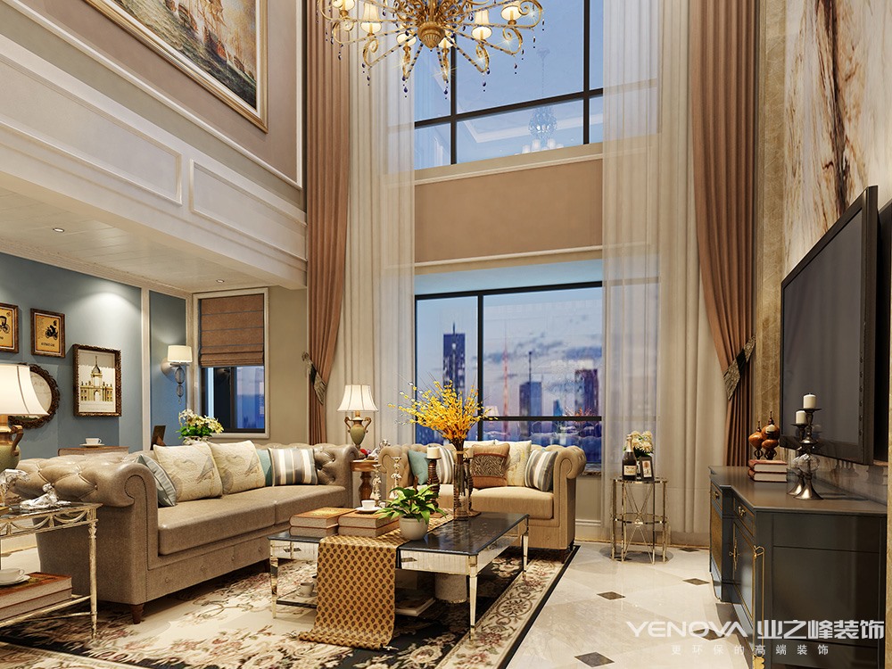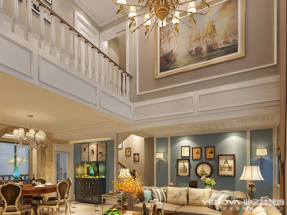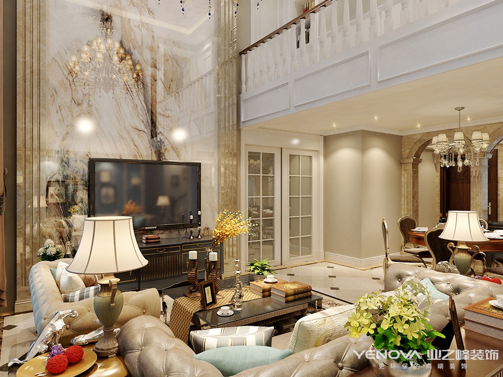 本案为五居室三厅的复式楼,对称的罗马柱电视背景墙,增添欧式的韵味,也使空间有了延伸。为了丰富以及让视觉饱满镜子,护墙板,钛金,硅藻泥,各种材质的碰撞,让空间刚中带柔,温馨、轻奢妙曼而生。因是人居空间,在色感上穿插了暖调为主。大地色系的添加,令人强烈地感受传统痕迹与浑厚的文化底蕴,使空间增加了沉稳与温馨感。