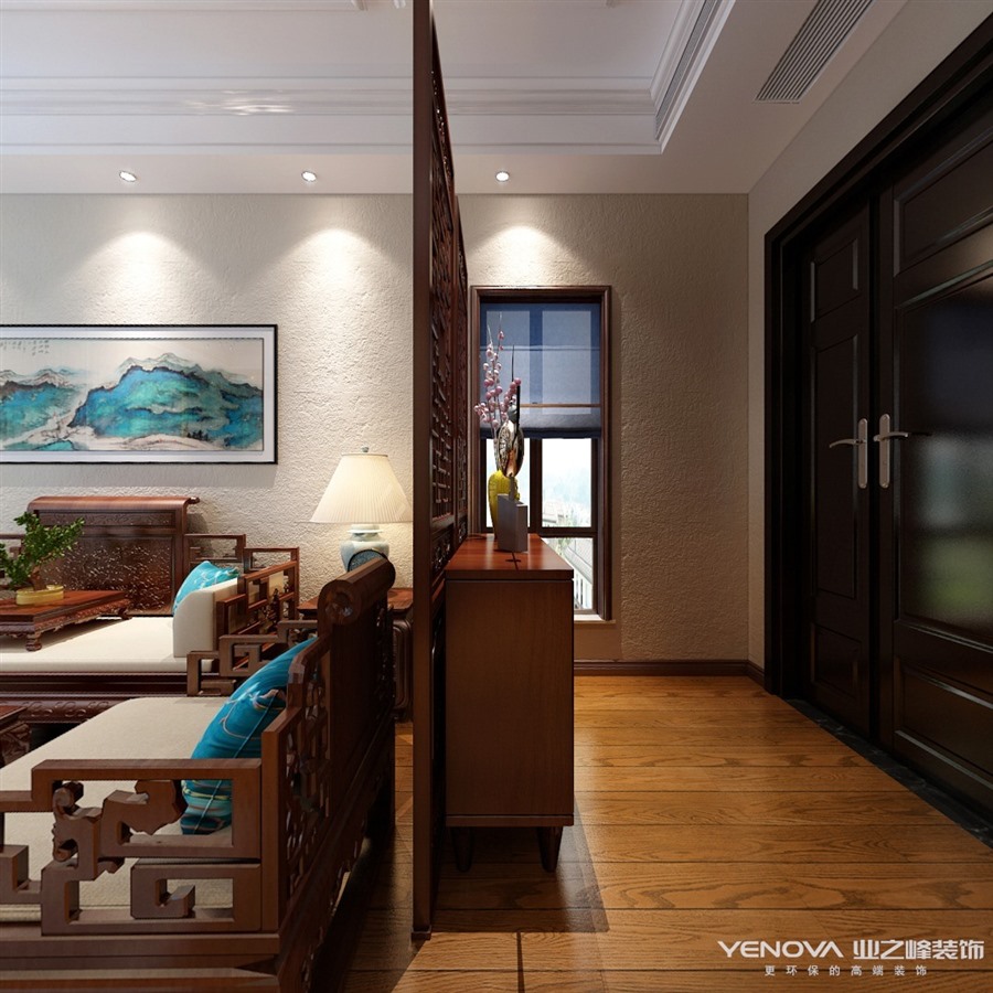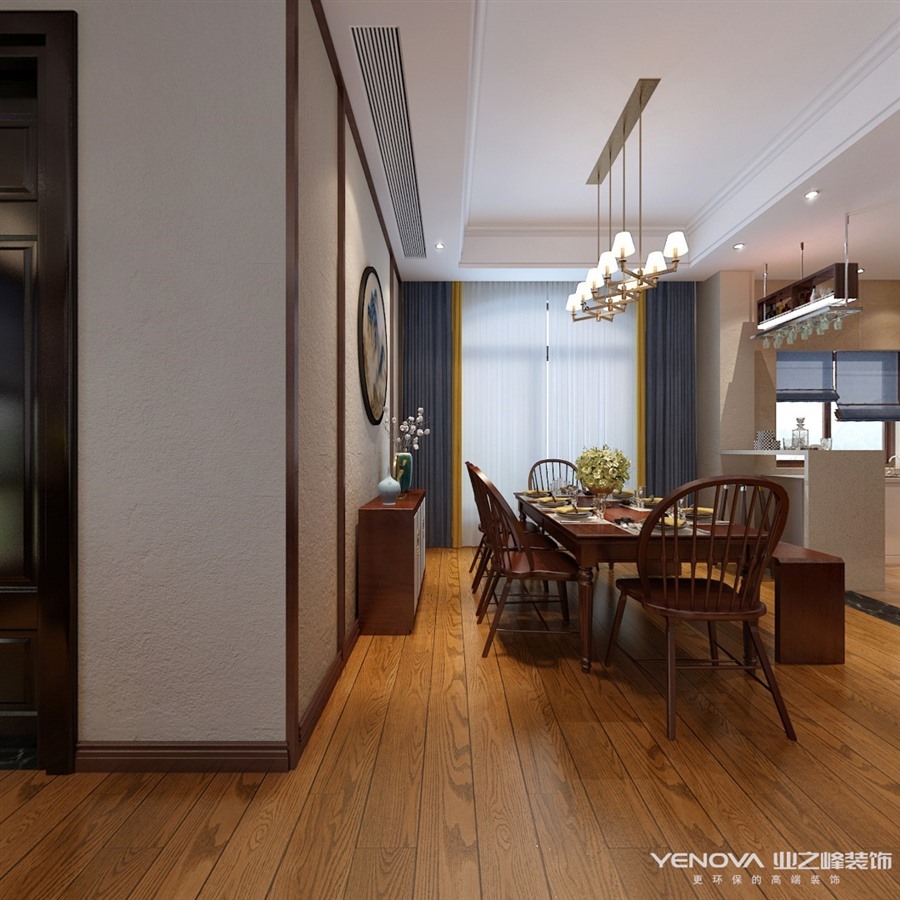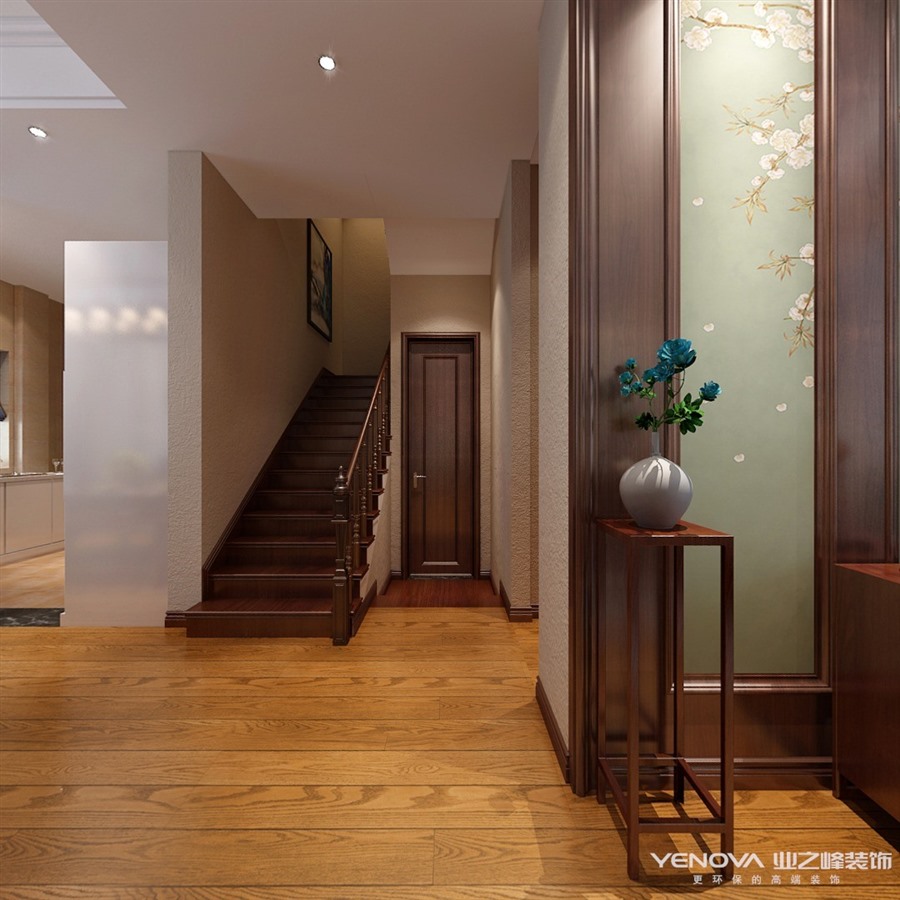 该户型为地上三层,风格定位为中式风格。一层结构户型方正,应客户需求,将厨房墙体拆除,做敞开式厨房。二层改变门洞的位置,做出一个大的套间并作出两个小房间,优化其功能。三层布局相对分明,主要休闲,储藏,居住为一体。软装搭配方面,餐厅采用红木家具,突显中式带来的古典高贵。开放厨房的大理石吧台,为中式带来的沉闷带来了一丝丝现代气息。餐厅上空的条形吊灯与餐桌形态遥相呼应,使空间融为一体,不显突兀。边柜与装饰圆形壁画点缀白色墙面,中式文化韵味十足。电视背景为典型的梅兰竹菊壁画,搭配实木护墙板,增添整体文化韵味。